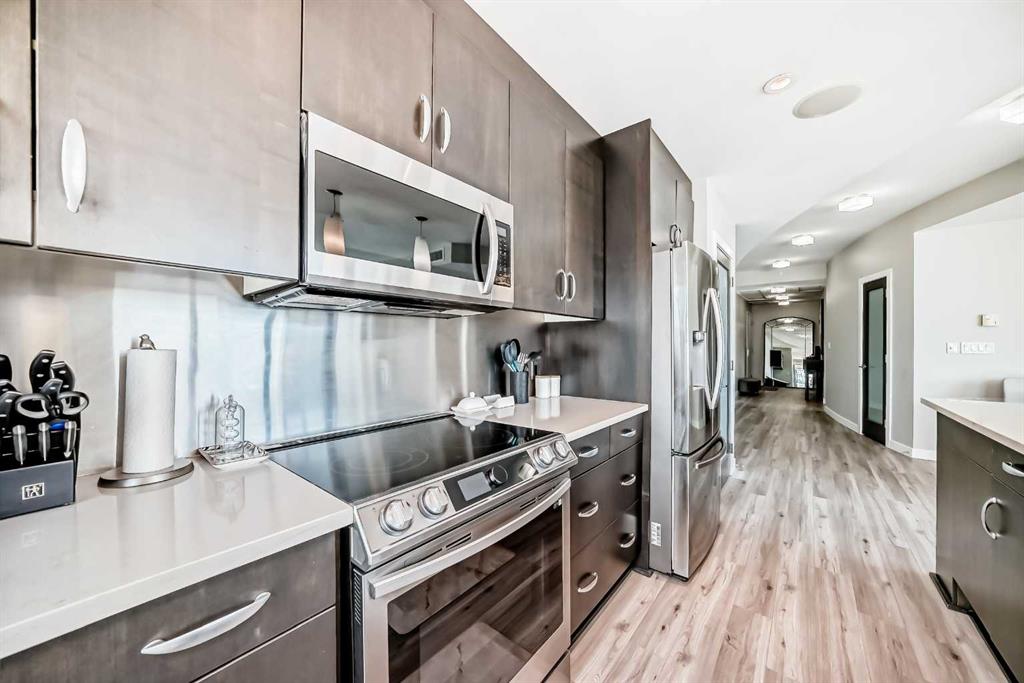 The generous kitchen is designed for both everyday living and entertaining, complete with extensive cabinetry, stainless steel appliances, quartz countertops, and a built-in wine cooler. The bright living area is surrounded by glass and seamlessly extends to an impressive 190 sq. ft. balcony with sweeping city views, creating the perfect setting for entertaining or relaxing while enjoying spectacular sunsets and the vibrant downtown skyline.