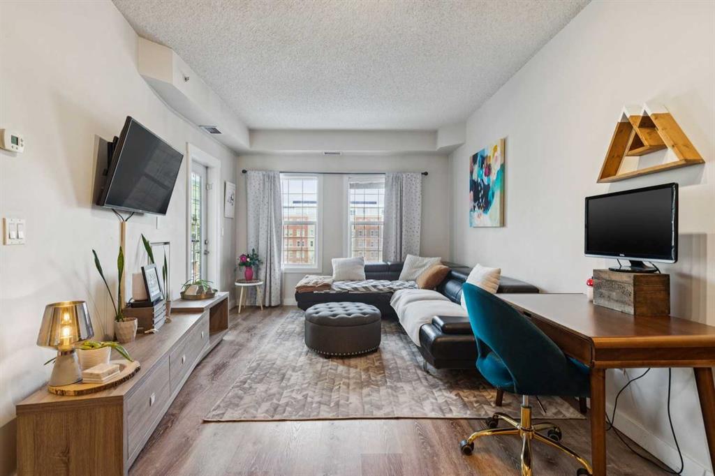 Quiet fourth-floor courtyard unit with 9’ ceilings, central A/C, and a private balcony with natural gas BBQ overlooking landscaped green space, positioned away from traffic for added privacy. This 2 bedroom, 2 bath + den layout offers true work-from-home flexibility with a fully enclosed office space and a well-proportioned living and dining area. The kitchen features granite countertops, stainless steel appliances, and full-height cabinetry. Award-winning 2025 Condo of the Year building with a full fitness centre, social lounge, rentable