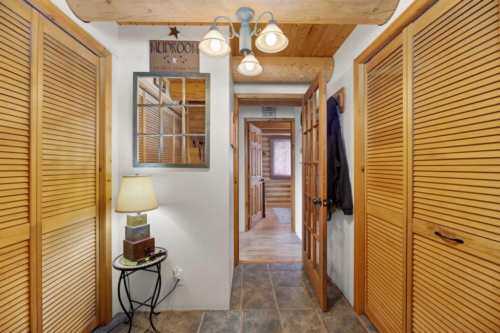 Saddle up & step into a life where wide-open skies meet the warm embrace of handcrafted logs—this 1½-story beauty is where cowboys & cowgirls truly live the dream. Beautiful & rustic ride side by side in this 1,549 sq ft above-grade log home, offering 5 bedrooms total & room for every member of your posse. The spacious primary suite rests on the main floor, with plenty of room for your full bedroom set, a generous walk-in closet, & easy access to the main floor laundry closet. After a long day on the range, retreat to the dreamy 4-piece bath featuring a classic clawfoot tub—perfect for soaking under candlelight while the prairie wind whispers outside. The open-concept main floor is built for gathering. Large windows on all sides pour in natural light, illuminating the beautifully maintained log beams overhead. The well-laid-out kitchen boasts abundant cupboard space & a grand island with seating—a place for cowpokes to pull up a chair, share a hearty meal, & swap stories of the day’s adventures. Upstairs, two more spacious bedrooms stand ready for family or guests, separated by a charming 3-piece bath complete with a deep soaker tub to wash away the dust of the trail. Down below, the fully developed basement is made for memory-making. A large family room offers space for a games area & movie nights alike. Two additional bedrooms—one currently serving as a fine home office—provide flexibility for growing families or visiting ranch hands. A full 3-piece bathroom on this level ensures comfort & convenience without having to head upstairs. When summer evenings roll in, the enormous covered front deck becomes your front-row seat to prairie sunsets blazing in the western sky. Watch your stock roam & play, or stroll over to the sheltered firepit area just steps from the home—perfect for roaring fires, laughter, & s’mores under the stars. And for your rigs and equipment? An oversized, finished, triple detached garage awaits—heated with radiant heat. Two bays are fully finished, while the single bay offers cold storage for all your gear. And to finish it all off. A well set up Tack shed for all your gear. Set up, move-in ready, & just minutes to town for all amenities, this must-see property is the kind folks write songs about. You won’t believe your eyes. “Home Is Where Your Story Begins!”