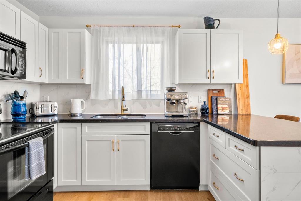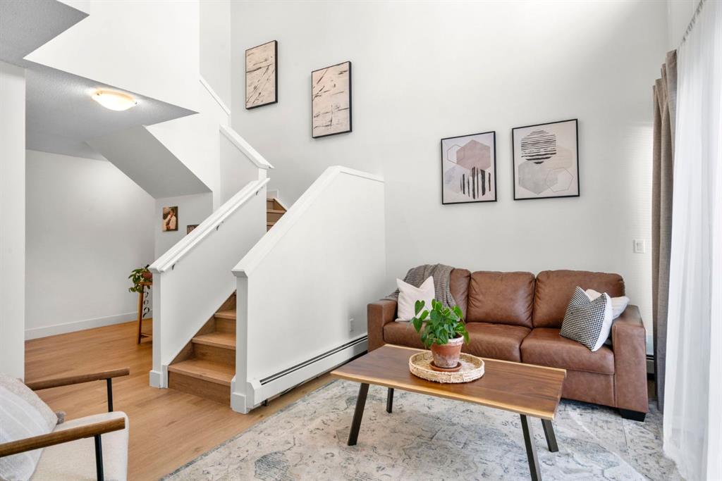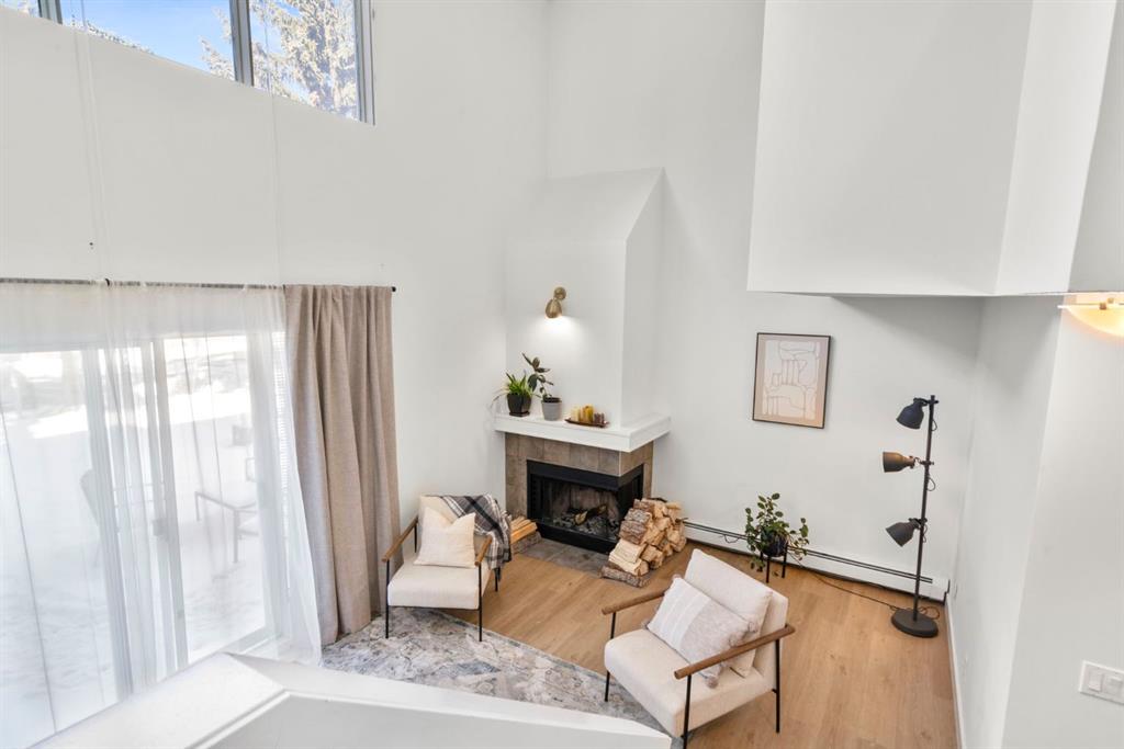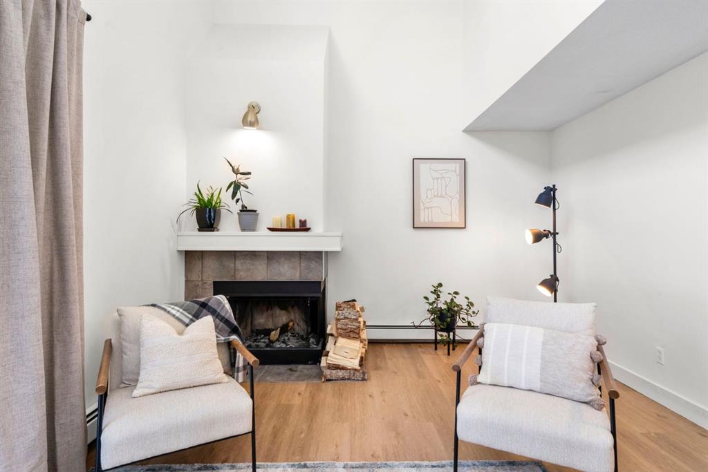 Welcome to this beautifully updated loft-style condo in The News from Broadcast Hill located in Patterson - a mature, desirable west-side neighbourhood known for it’s quiet streets, extensive pathways and convenient access to downtown. Offering over 1,000 sq. ft. of living space, this 2-bedroom, 1.5-bathroom home features a bright and airy layout with soaring high ceilings and large windows that fill the space with natural light. Fresh, modern updates make this unit completely move-in ready: the entire home was professionally painted in 2022, new vinyl flooring was installed throughout in 2022, and the main bathroom was fully renovated in 2023. As you step inside, you’ll find a convenient powder room and in-suite laundry, with the kitchen down the hallway on the right. Bright and inviting, it features granite countertops with plenty of counter space and cabinets, a newer Bosch dishwasher, a window over the sink, a pantry and a peninsula with seating — great for casual dining. The adjacent dining area opens onto a spacious east-facing patio surrounded by mature trees with downtown views, offering beautiful morning sunlight and a peaceful outdoor setting for coffee or meals. The living room with high ceilings is open and airy, centered around a cozy wood-burning fireplace and offering access to a second, west-facing patio. Upstairs, you’ll find two well-sized bedrooms, a linen closet, and the beautifully renovated 4-piece bathroom complete with double vanity, an oversized walk-in shower, and added built-in storage shelving. This unit also includes underground parking and a separate storage locker for extra convenience. Pets are welcome with board approval. Residents enjoy exceptional amenities including an indoor pool, hot tub, fitness centre, racquet courts, party room, visitor parking, and scenic walking paths throughout the complex. Condo fees include all utilities except electricity, adding excellent value. Short commute to downtown, shopping, transit, parks, and schools — and only a short drive to WinSport - this home offers an ideal balance of comfort, updates, and location in one of Calgary’s most desirable, tree-lined communities. Book your private showing today!