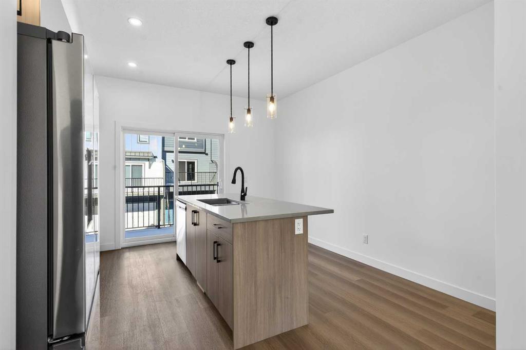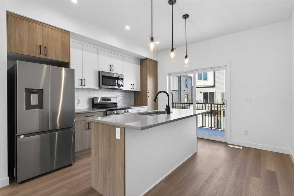 The open-concept main floor features 9\' ceilings and is bathed in natural light, creating a cozy and welcoming atmosphere for daily living or entertaining guests. The modern kitchen is equipped with quartz countertops, a breakfast bar, high-end stainless steel appliances, and a chimney-style range hood. Sliding doors lead to a full-sized balcony — perfect for unwinding or dining outside.