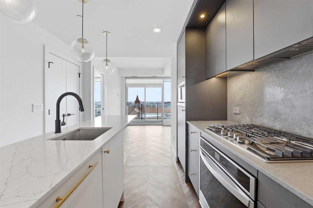 Welcome to Gateway by TRUMAN, perfectly positioned in Calgary’s vibrant, master-planned West District. Built with concrete construction, this residence delivers refined design, elevated finishes, and effortless urban living. This 2-bedroom, 2-bathroom condo with titled underground parking showcases chevron wide-plank flooring, designer lighting, and smooth flat-painted ceilings for a clean, contemporary aesthetic. Expansive floor-to-ceiling windows flood the interior with natural light and frame impressive city views, while central air conditioning provides year-round comfort. The chef-inspired kitchen is both striking and functional, featuring matte custom cabinetry, brushed-gold accents, quartz countertops and full backsplash, under-cabinet lighting, and a generous eating bar. Premium appliances include a gas cooktop, wall oven, 36” Fisher & Paykel integrated refrigerator, panelled dishwasher, and statement hood fan. Open-concept living and dining areas extend seamlessly to a private balcony. The primary suite offers a walk-in closet and spa-inspired ensuite complete with quartz counters, mosaic tile detailing, and a glass-enclosed shower. The second bedroom provides versatility as a guest room or home office, with convenient access to a stylish four-piece bath. Additional highlights include in-suite laundry, excellent storage, and secure titled underground parking. Residents enjoy upscale amenities including a rooftop patio, owner’s lounge, concierge service, bike storage, EV charging stations, and visitor parking. Surrounded by parks, pathways, boutique shopping, cafés, and dining, this is elevated urban living in one of Calgary’s most desirable communities.