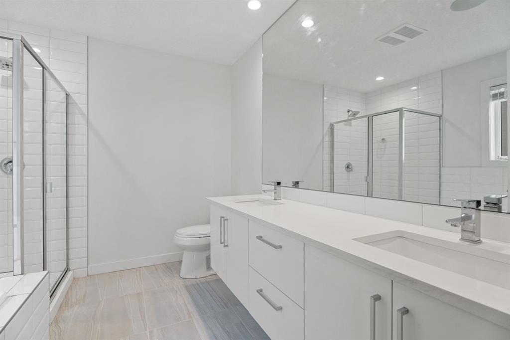 Upstairs, two private bedroom suites offer exceptional comfort. The vaulted primary retreat is a true sanctuary, complete with a walk-in closet and a spa-inspired five-piece ensuite featuring heated floors and a calming, retreat-like atmosphere.