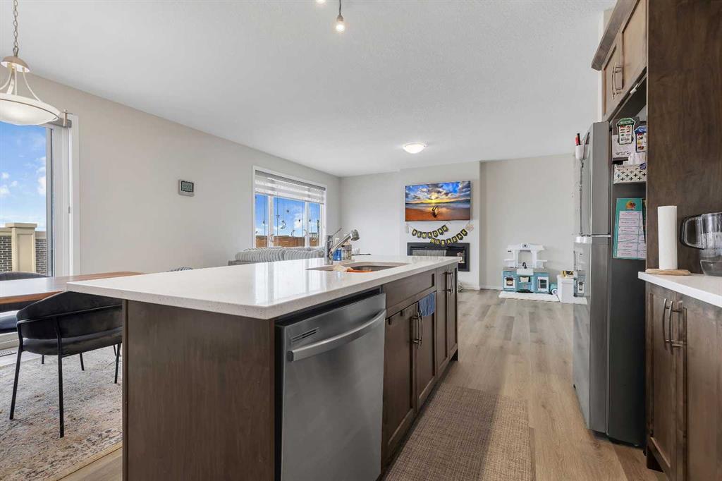 The main floor features a bright and open layout with 9-foot ceilings, large windows, and luxury vinyl plank flooring extending through both the main and upper levels. The spacious living room is highlighted by a central fireplace, creating a warm and inviting atmosphere. The kitchen is both stylish and functional, showcasing maple cabinetry, quartz countertops, a large centre island, stainless steel appliances, and a generous pantry. Just off the kitchen is the dining nook with patio doors leading to the fully fenced and landscaped backyard — perfect for entertaining or relaxing outdoors. Upstairs, you’ll find a well-designed floor plan complete with a bonus room, a spacious primary bedroom featuring a walk-in closet and full ensuite, plus two additional bedrooms, a full bathroom, and a convenient upper-level laundry room. The unfinished basement includes a separate side entrance, offering excellent potential for future development or a possible suite (subject to city approval). Additional features include central air conditioning, a double attached garage, a large driveway, great curb appeal, and a quiet street location.