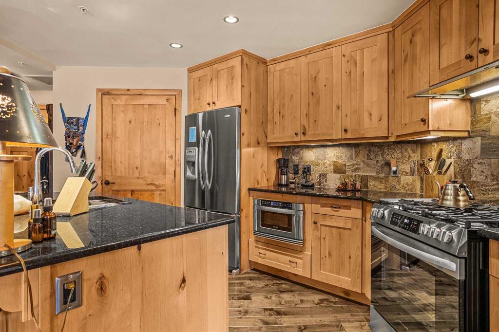 Nestled in the prestigious Moraine Ridge at Spring Creek, this exceptional and spacious 2-bedroom + den, 2-bath residence captures unobstructed mountain views across the landscaped courtyard, Policeman’s Creek, and the municipal reserve. The open-concept layout seamlessly connects the kitchen, dining, and living areas, flowing onto a private deck to take in the alpine scenery. Brazilian hardwood floors, fresh paint, and a striking river rock fireplace create warm mountain character. The modern kitchen offers stainless steel appliances and generous workspace. Thoughtfully designed, the floorplan provides excellent separation between bedrooms and a spacious, functional office. Bathrooms feature natural stone and a spa-inspired feel. Additional highlights include air conditioning, one heated underground parking stall, and a storage locker. Located in a 40+ building (no short-term rentals) just steps to shops, dining, and trails — refined, peaceful living in the heart of Canmore.
