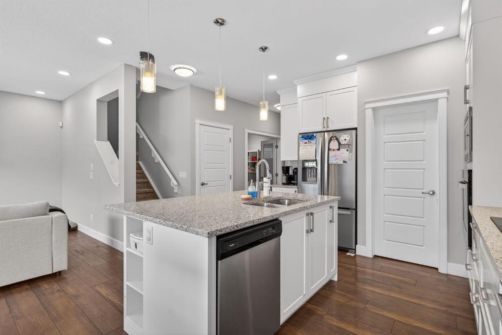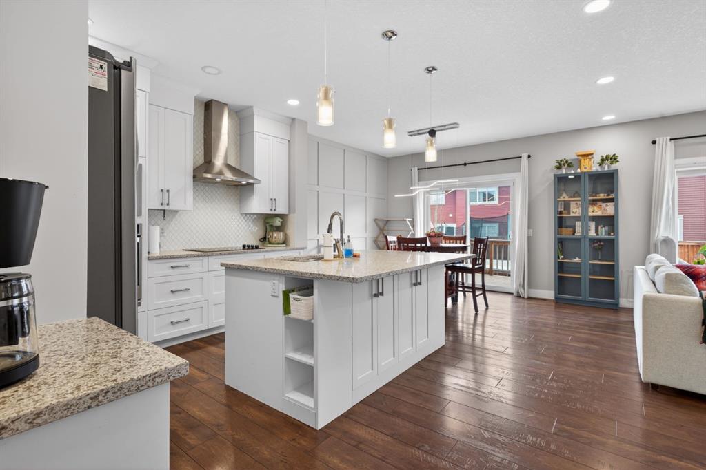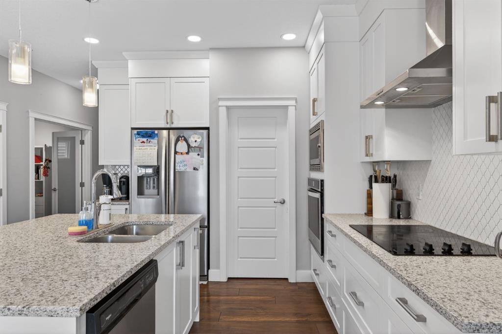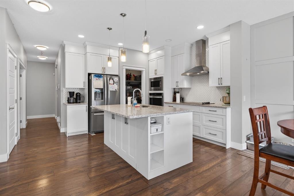 The home features white shaker-style kitchen cabinetry, quartz countertops, and a large central island. Premium built-in stainless steel appliances and a walk-in pantry complete this gourmet kitchen. The open-concept family room is ideal for entertaining family and friends, while the dining area opens onto a raised deck overlooking a beautifully finished yard with a striking fence.
