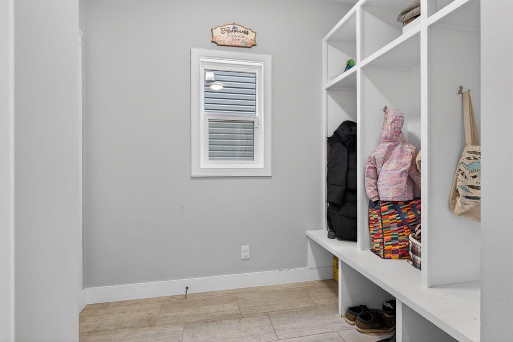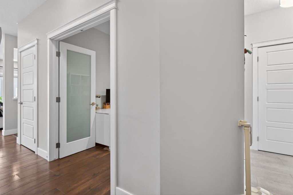 The bright living room offers an oversized window and a cozy, child-safe ledgestone fireplace with cool-to-the-touch glass. Durable hand-scraped laminate flooring runs throughout the main floor — perfect for busy households. A standout feature is the enclosed main-floor office with etched-glass French doors, providing a private workspace. A tiled mudroom off the garage adds practical storage, including a full closet for organized family living.
