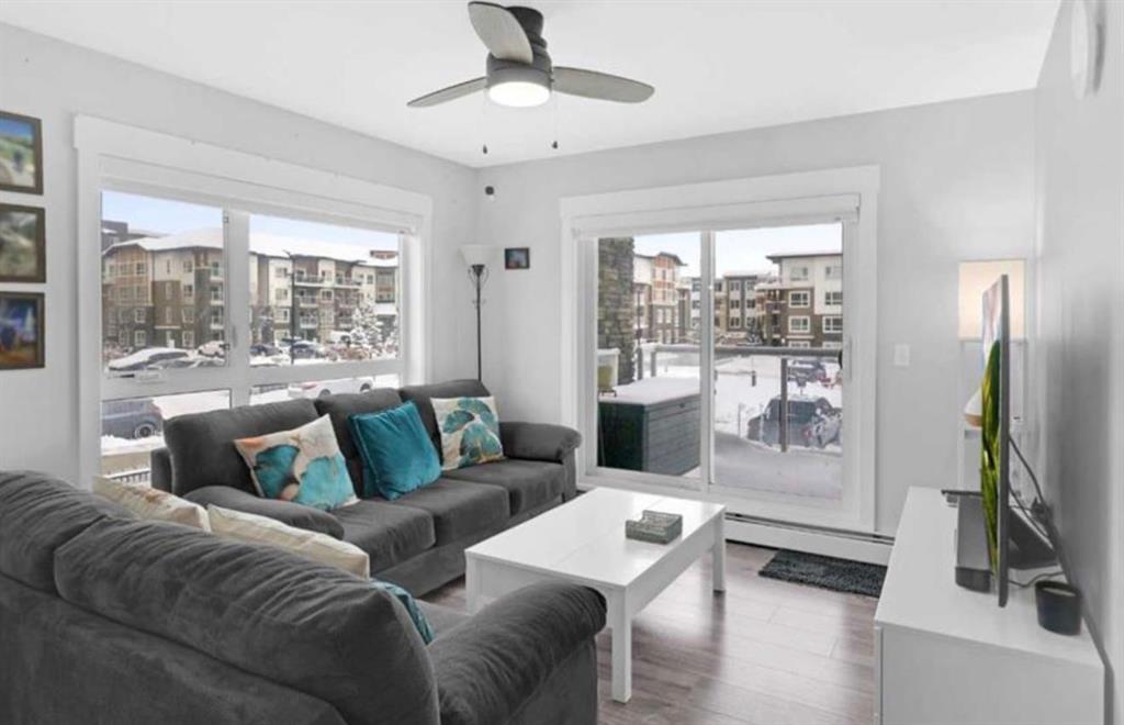Welcome to this beautifully maintained and UPGRADED CORNER UNIT CONDO, located on the second floor offers over 943.5 sq ft of comfortable living space, featuring 2 spacious bedrooms, 2 full bathrooms, and the convenience of titled heated underground parking and secure caged storage locker. As you enter, you’ll be greeted by an open-concept design that includes a well-appointed kitchen, a dining area, and a versatile flex space perfect for an office. The kitchen is a chef’s dream, featuring a large counter with bar seating, granite countertops, stainless steel appliances. The owner has invested over $15k in upgrades including CUSTOM CABINETRY , HALL TREE ENTRYWAY BENCH ,COAT RACK with SHOE STORAGE, SMART LOCK for main DOOR , WATER PURIFIER ,SAMSUNG DISHWASHER, NEW LIGHT FIXTURES( Kitchen and dining) and BOTH WASHROOMS FIXTURES, New VINYL PLANK FLOORING (no carpet) has been installed throughout the unit, PATIO TILES, REMOTE CONTROLLED ZEBRA BLINDS for all windows and CEILINGS FANS in both bedrooms and Living room add extra convenience and comfort and beautiful Balcony to spend time with friends ,enjoying BBQ.Located in the vibrant Skyview Ranch community, this condo offers easy access to local amenities, parks, schools, shopping, and major roadways. Whether you\'re a first-time homebuyer, a growing family, or someone looking for a modern, low-maintenance property,