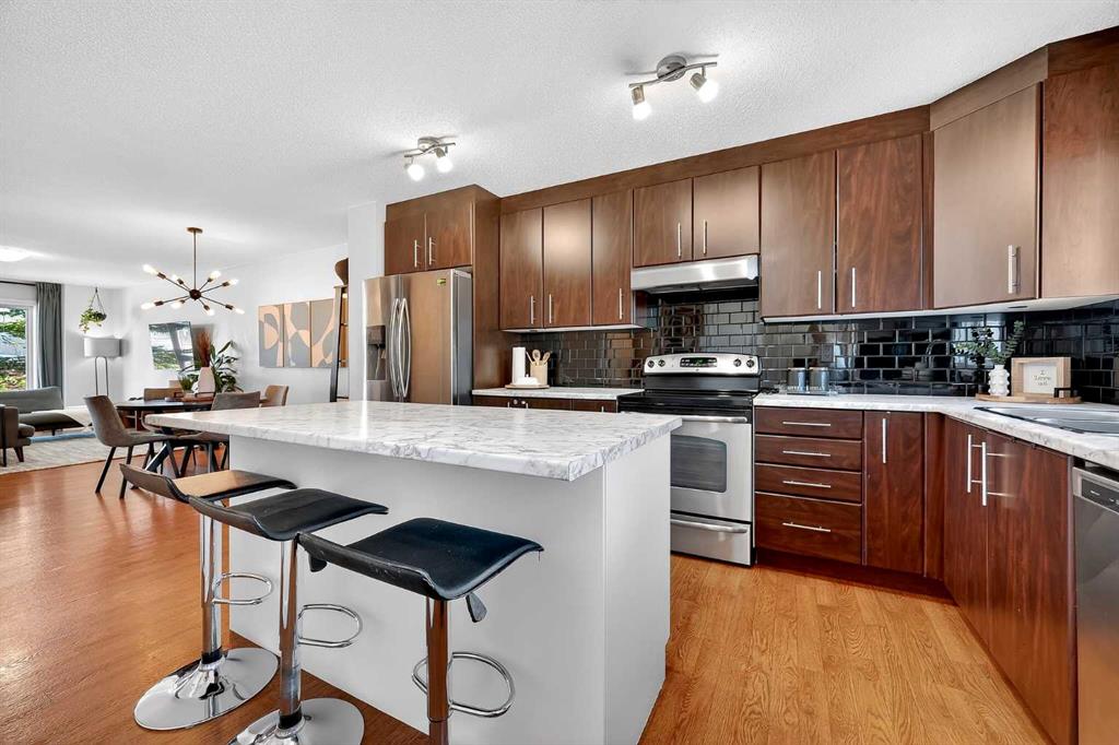 Step into homeownership with confidence in this well-designed 3-bedroom, 2.5-bath townhouse in Airdrie, offering over 1,700 sq ft of living space, including the finished basement for added flexibility. The main level features a bright, functional layout with a spacious living area, dedicated dining space, and a generous kitchen complete with a pantry, ample cabinetry, and a large centre island—perfect for weeknight dinners or hosting friends. A convenient 2-piece bath rounds out the main floor. Upstairs, the primary bedroom offers impressive space and privacy, while a second large bedroom and full bathroom provide comfort for family, guests, or the flexibility for a home office or nursery. The finished basement adds even more versatility with a third bedroom, full bathroom, and a large rec room—ideal for a media space, gym, or work-from-home retreat.