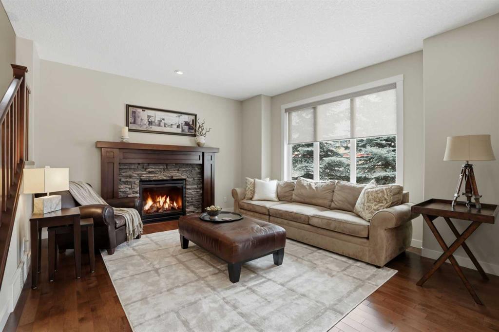 Step inside to an inviting open-concept main floor where warm hardwood flooring and large windows fill the home with natural light. The welcoming living room is anchored by a river rock-faced gas fireplace for relaxing or entertaining.