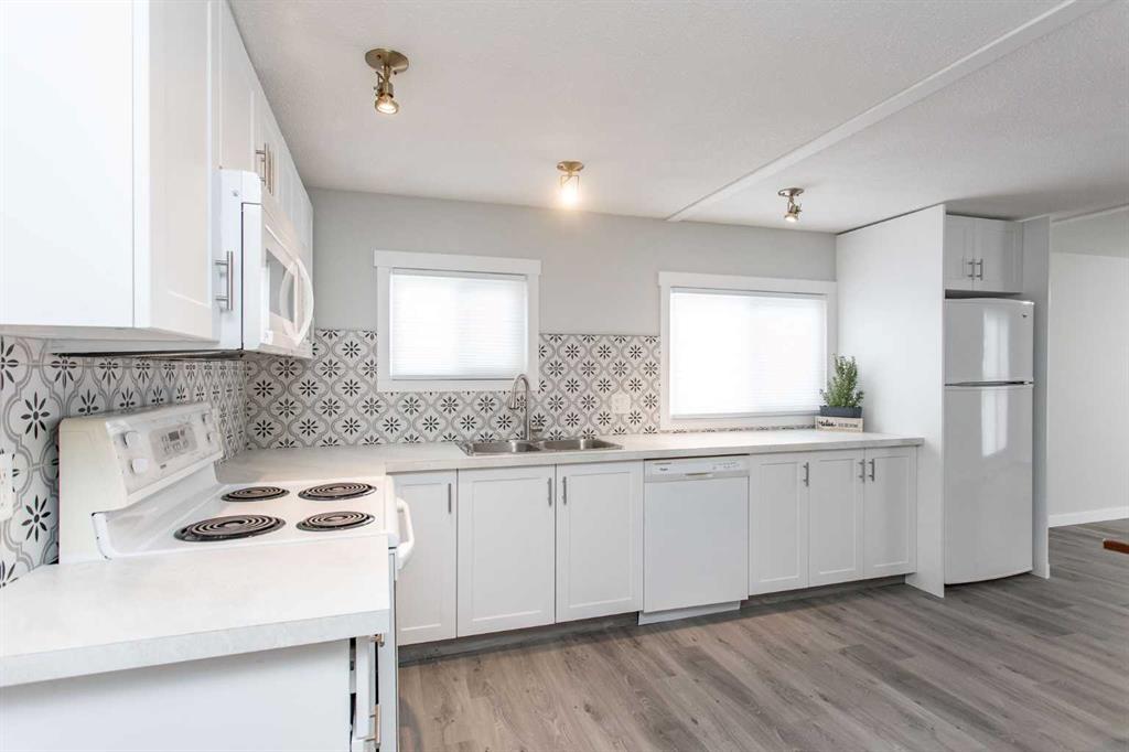 This updated 3-bedroom mobile home offers a comfortable layout with practical upgrades throughout. The entrance features a good-sized mud room with vinyl flooring and leads to one of the bedrooms located in the addition, complete with an electric heater. The main area of the home has been refreshed with a brand new kitchen, including white cabinets, laminate counters, tiled backsplash, updated appliances, and vinyl flooring. The living room is large and bright, with vinyl windows and vinyl plank flooring. The home continues with two additional bedrooms featuring brand-new carpet, plus a 4-piece bathroom with a new vanity and convenient in-bath laundry (stackable washer and dryer). Fresh paint, drywall throughout, newer trim, and updated interior doors add to the modern feel. The home has a metal roof, modern vinyl siding, and sits on a treed, fenced lot with a large deck for outdoor space. New Washer/Dryer Combo (2026), Furnace (approx. 1996) and hot water tank (2011) are in place; electrical is believed to have been updated by a previous