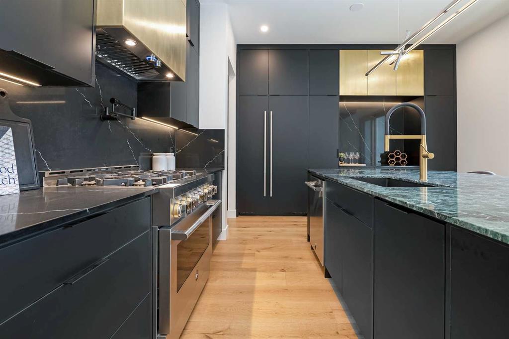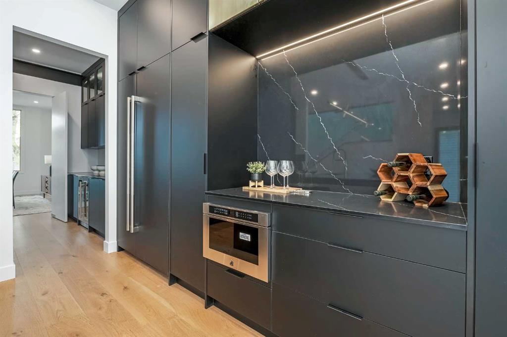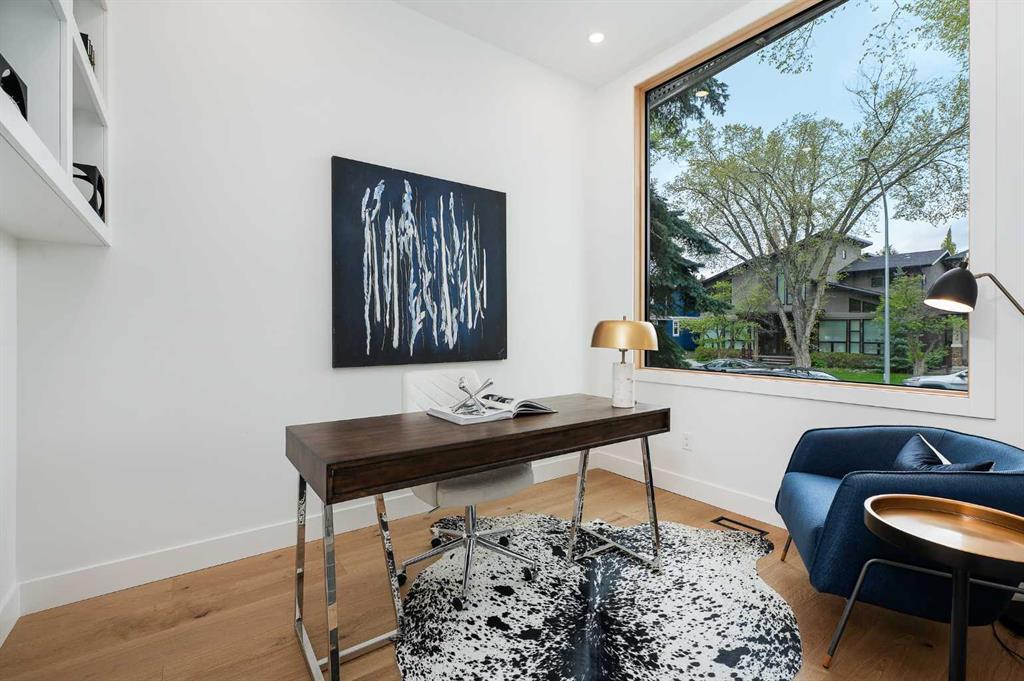 Steps from Confederation Park, this striking architect-designed residence in Mount Pleasant offers over 4,500 sq ft of meticulously crafted living space, combining thoughtful design with exceptional inner-city livability. Conceived and executed by an award-winning design studio behind several notable architectural and public art projects, the home reflects a rare level of intention, craftsmanship, and material integrity seldom seen in infill construction. Its sculptural façade, engineered to subtly respond to Calgary’s Chinook winds and enhanced with programmable architectural lighting, creates a dynamic street presence that shifts beautifully from day to night. A welcoming concrete patio and thoughtfully curated landscaping establish an inviting sense of arrival. Inside, the main level unfolds in a bright, open layout designed for both refined entertaining and comfortable everyday living. Wide-plank hardwood floors, soaring ceilings, and expansive windows create strong visual connections throughout the home. The front dining area offers an elegant setting for hosting, while the chef-inspired kitchen features an oversized Verde Alpi marble island, custom cabinetry with brass accents, JennAir appliances, and a discreet butler’s pantry with direct access to the dining room. At the rear, the living room is anchored by a dramatic feature wall clad in imported large-format tile, complemented by integrated shelving with mood lighting and a smart fireplace. Large glass doors open to the expansive rear deck and sunny south-facing yard, creating seamless indoor–outdoor flow. A private office off the foyer provides a quiet and refined work-from-home setting. The upper level hosts four spacious bedrooms thoughtfully arranged for family living. The primary retreat feels like a private sanctuary, offering access to a serene balcony, generous walk-in closet, and a spa-inspired ensuite with freestanding soaker tub, oversized glass shower, and dual vanities. A second bedroom enjoys its own ensuite, while the remaining bedrooms offer flexibility for children or guests. A well-appointed laundry room with built-in storage completes this level. The fully developed lower level extends the home’s living and entertainment spaces with a large family/media area, full bath, and two flexible rooms ideal for a gym, studio, or guest accommodation. Comfort-focused and future-ready features include central A/C, speaker rough-ins, and a full elevator rough-in connecting all three levels. Outdoor living is equally impressive with a sunny south-facing backyard, expansive deck, custom fencing, and architectural lighting. A rare, insulated triple detached garage with EV charger adds exceptional convenience and storage. Perfectly positioned steps from Confederation Park, and close to SAIT, the U of C, schools, restaurants, shopping, and transit, this remarkable home offers a rare opportunity to own an architect-designed residence where design, craftsmanship, and everyday livability converge.