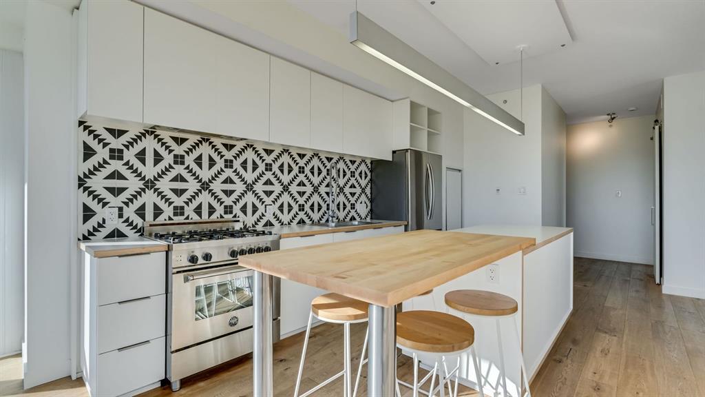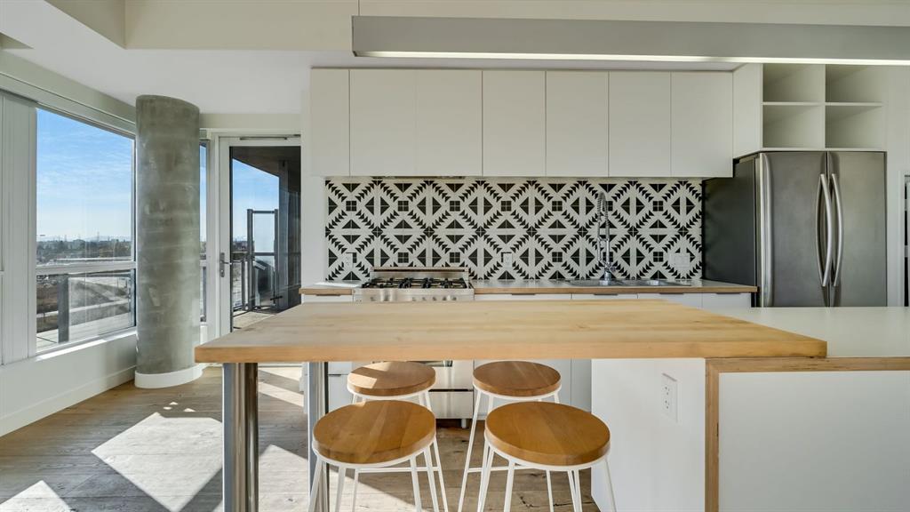 natural light and boasts views of the Bow river and the mountains. The gourmet kitchen, gas range stove, balcony with gas hook-up and dining room