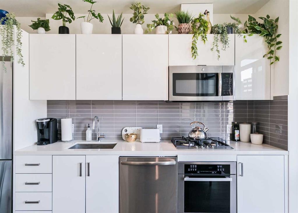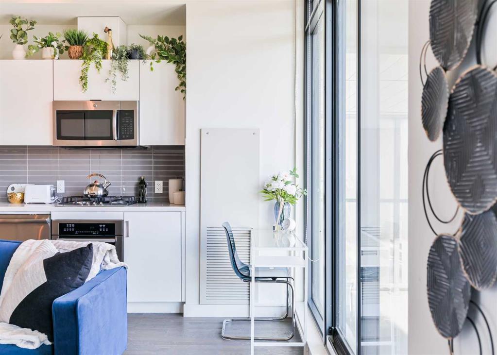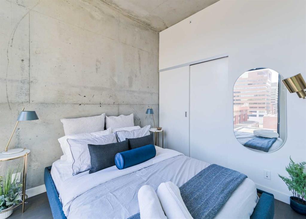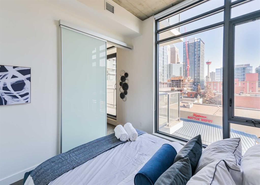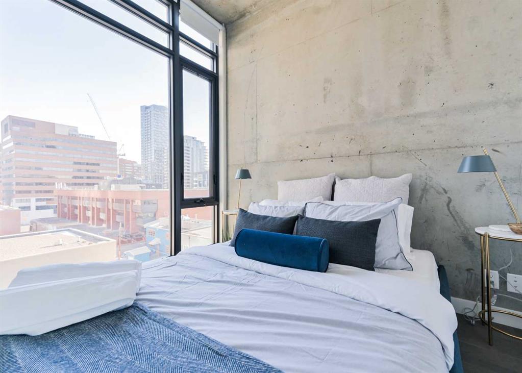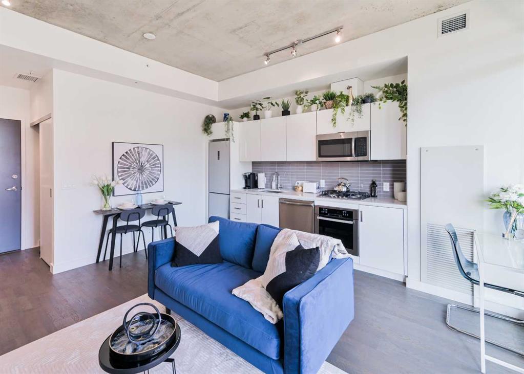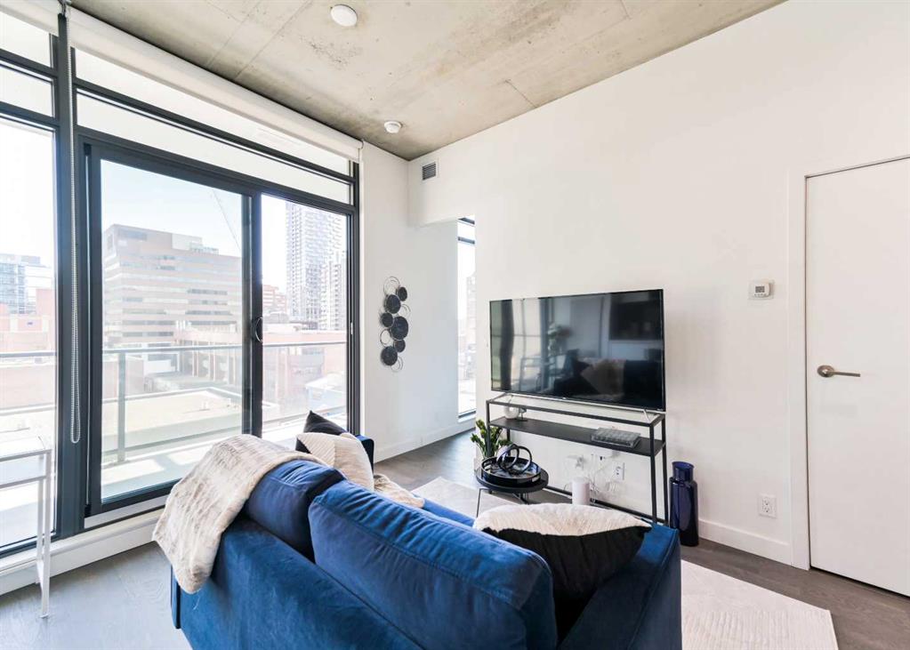 * Furniture included and Air bnb Friendly + Titled parking - In the heart of the Beltline, you\'ll find this trendy urban 1 bedroom + 1 bathroom condo at 6th And Tenth. This is your chance to experience true downtown living! You will instantly gravitate to the expansive 100 sqft balcony to breathe in the amazing city views. Inside, you will find an open floor plan showcasing hardwood flooring, flooded with light with the floor-to-ceiling windows, neutral colours, industrial loft-style exposed concrete walls + ceilings, and 9ft ceilings. The stylish + minimalist kitchen with quartz counters, modern high gloss cabinets, stainless steel appliances, countertop gas range, built-in oven, microwave hood fan + subway tile backsplash. This unit comes with a generous-sized bedroom, ample closet space and a modern 4 piece bathroom with frosted glass sliding doors - a true space saver. In-suite laundry, out the perks for this property. Enjoy the fantastic owner\'s privileges, including executive concierge and Sky Lounge, bicycle storage, fitness room, outdoor pool deck, exterior water features, and state-of-the-art security including in house concierge. A favourite inner-city community - walk to local entertainment, cafes, cocktail bars, restaurants, grocery, the c-train, retail shopping + downtown office core.