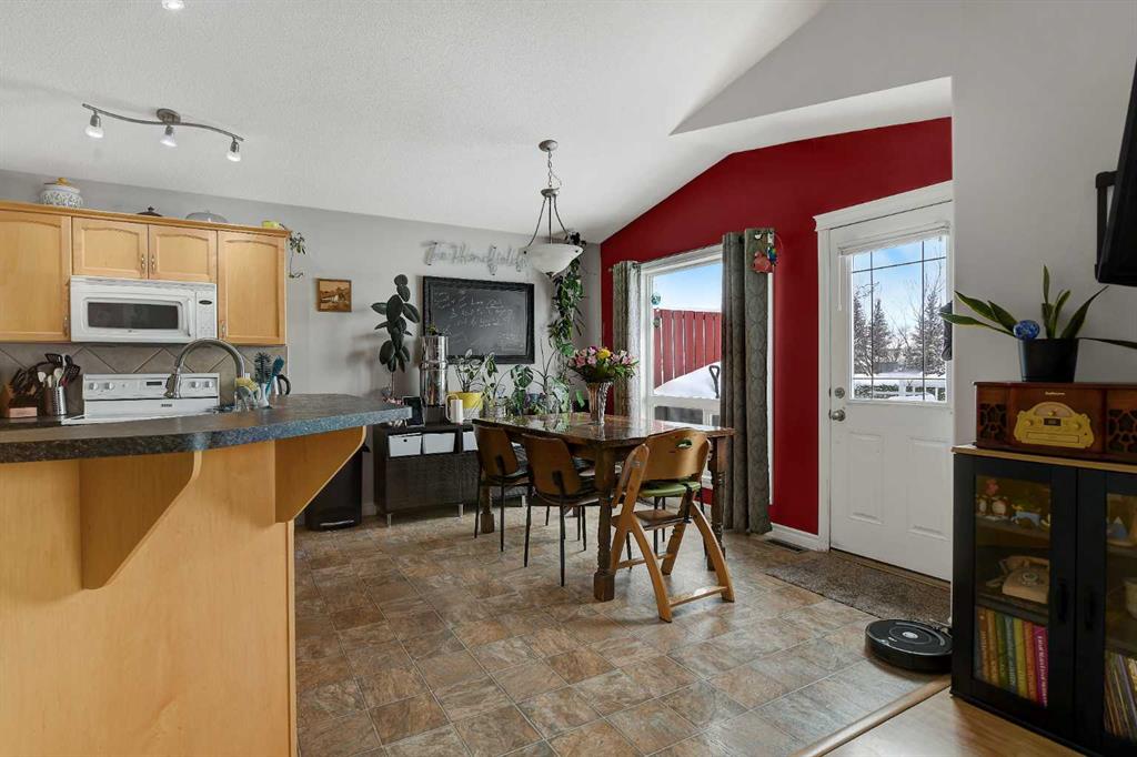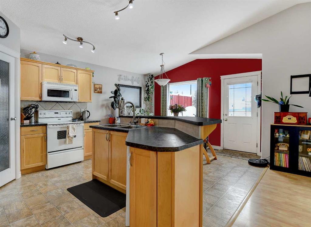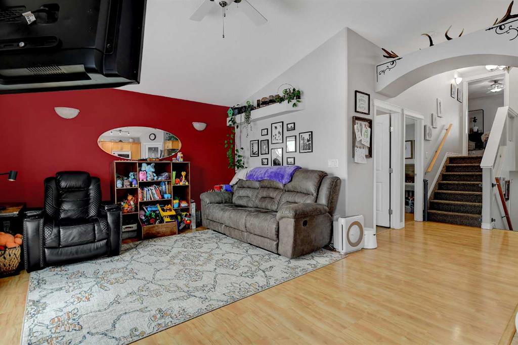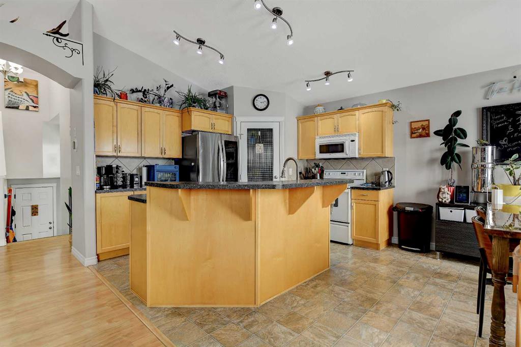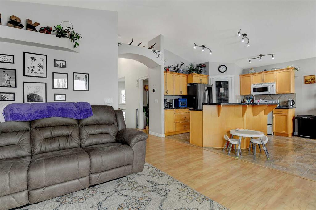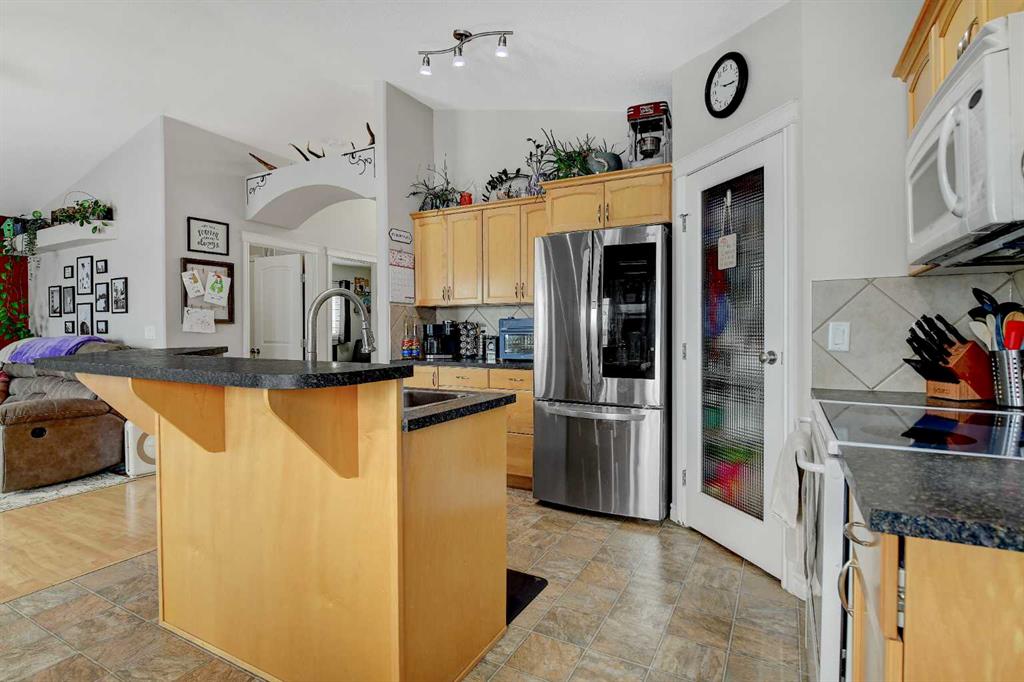 Welcome to this beautifully maintained modified bi-level tucked away on a quiet, low-traffic street in a highly desirable family neighbourhood. With NO rear neighbours and parks and two schools just steps away, this location offers both privacy and convenience. Inside, you’ll love the bright and airy feel created by vaulted ceilings and an open-concept layout that seamlessly connects the kitchen, dining, and living areas — perfect for entertaining or keeping the family connected. The kitchen offers abundant cabinet space, a corner pantry, large island, and tasteful tile backsplash, making it both functional and stylish. This home features 4 bedrooms and 3 full bathrooms, including 3 bedrooms and 2 bathrooms upstairs. The spacious primary suite includes a walk-in closet and private 3-piece ensuite, creating a comfortable retreat at the end of the day. The fully developed basement adds even more flexibility, featuring 1 bedroom, 1 full bathroom, and a convenient kitchenette — ideal as a wet bar, guest space, or a practical setup for blended families or multi-generational living. Stay cool in the home on those warm summer nights with A/C tied directly into the house! Step outside to enjoy the impressive two-level deck spanning the back of the home, perfect for summer BBQs and gatherings. The yard is fully landscaped and fenced, with a shed for additional storage. The added bonus of great neighbours on both sides makes this home even more special. Recent updates include a newer hot water heater, fridge, dishwasher, washer and dryer, fresh paint, and updated landscaping, ensuring this home is move-in ready. A well-cared-for home in an exceptional family-friendly area — this one truly checks all the boxes.