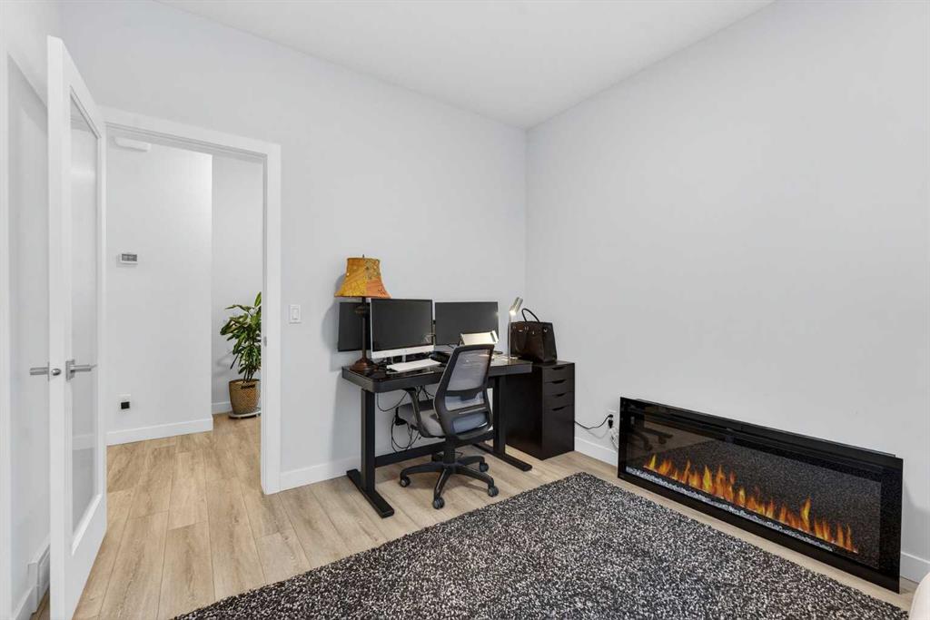 The main floor features a bright open-concept layout with durable vinyl flooring throughout, large windows, and plenty of natural light. A versatile main floor bedroom/flex room—currently used as a home office—along with a full bathroom makes this level ideal for guests or multi-generational living.