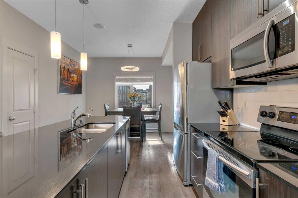 Thoughtfully designed across 1,530 sq ft, this move-in ready 3-storey townhouse delivers functional living in a prime, walkable Skyview Ranch location just steps from Prairie Sky School, transit and endless amenities. An oversized entry-level mudroom creates a practical drop zone for jackets, bags and seasonal storage while providing direct access to the insulated and drywalled Double Attached Garage, keeping vehicles protected year-round. Main living unfolds on the second level where 9’ ceilings and wide plank flooring enhance the sense of space and light. A welcoming living room invites relaxation with sliding doors to the balcony, supporting seamless indoor and outdoor living during warmer months. Nearby, a built-in office area offers a dedicated place to work from home, manage daily tasks or set up homework without sacrificing living space. Designed to anchor the open-concept layout, the kitchen features stainless steel appliances, full-height cabinetry for generous storage and a central island that encourages casual gathering and conversation. Designer lighting defines the adjacent dining area, creating an inviting setting for family meals and hosting friends. A privately tucked powder room adds convenience for guests. Upper-level living is thoughtfully arranged with a spacious primary retreat complete with its own 4-piece ensuite, offering privacy at the end of the day. A second bedroom is complemented by another full 4-piece bathroom, ideal for kids, guests or roommates. A flexible nook easily transitions into a reading corner, study area or play space as needs evolve. Convenient upper-level laundry eliminates the need to carry loads up and down stairs, simplifying everyday routines. Outdoor enjoyment extends beyond the balcony to a front-facing patio, providing an additional place to sit, barbecue or connect with neighbours. Set within Skyview Ranch and framed by big prairie skies, this home enjoys quick access to Deerfoot Trail and Stoney Trail while remaining surrounded by parks, pathways, schools and a wide range of shopping and services, supporting an easy, connected lifestyle.