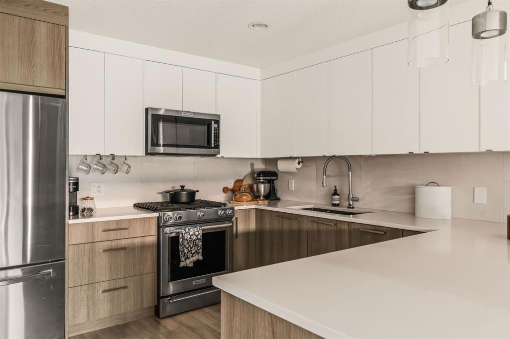 DESIGNER LUXURY IN HILLHURST | PRIVATE REAR RESIDENCE | EXTENSIVE UPGRADES | EXCLUSIVE STORAGE Discover an exceptional opportunity to own a beautifully upgraded luxury residence in the heart of Hillhurst, where sophisticated design, premium craftsmanship, and an extensive list of designer upgrades and custom finishes set this home apart. Thoughtfully positioned at the rear of the building, this residence offers a level of privacy and tranquility rarely found in inner-city living while still being moments from the energy and amenities of Kensington. Selected as the premium unit during construction, the rear location was originally priced higher than the front residence for its enhanced privacy, sound separation from Kensington Road, and peaceful outdoor setting. The home also enjoys convenient access to the detached parking area, making daily living both comfortable and practical. Inside, the quality of craftsmanship and design is immediately evident. The main living area is anchored by a stunning chef-inspired kitchen, beautifully appointed with quartz countertops, high-end appliances, and sleek cabinetry. Custom millwork touches, elevated fixtures, and carefully curated materials reflect the tens of thousands of dollars in upgrades invested creating a space that feels both refined and highly functional. A striking architectural skylight above the stairwell fills the home with natural light while adding an elegant design element that enhances the open feel of the interior. The living area seamlessly connects to a private outdoor patio, creating a quiet and inviting space for morning coffee, evening wine, or effortless entertaining. The upper level offers a serene primary retreat designed for comfort and luxury. The spa-inspired ensuite features marble flooring with in-floor heating and an impressive marble walk-in shower, delivering a boutique hotel experience within your own home. The level is further enhanced by custom closet built-ins and convenient second-floor laundry, thoughtfully designed to complement modern living. The fully developed lower level continues the home’s elevated finish quality, offering versatile space ideal for a media/Rec room, fitness area, or guest accommodations. Technology and comfort upgrades throughout the home further elevate the experience, including a Sonos sound system, Life Breath fresh air system, motion-sensing lighting in select areas, and a gas BBQ connection on the private patio. Adding to the home’s exceptional functionality is the detached assigned parking space, which includes a rare additional storage area not available to other units in the complex—providing valuable extra room for seasonal gear, or outdoor equipment. Located in one of Calgary’s most vibrant and desirable communities, this home boasts an impressive Walk Score of 86 and a perfect Bike Score of 100. A Kensington lifestyle dream! Book your showing today!