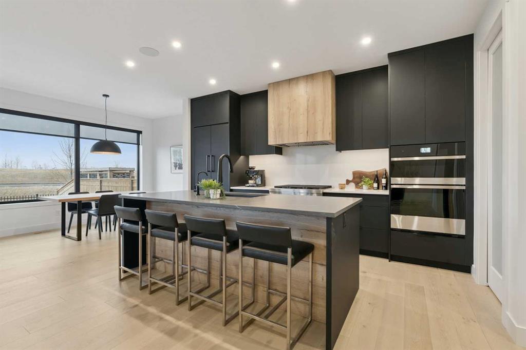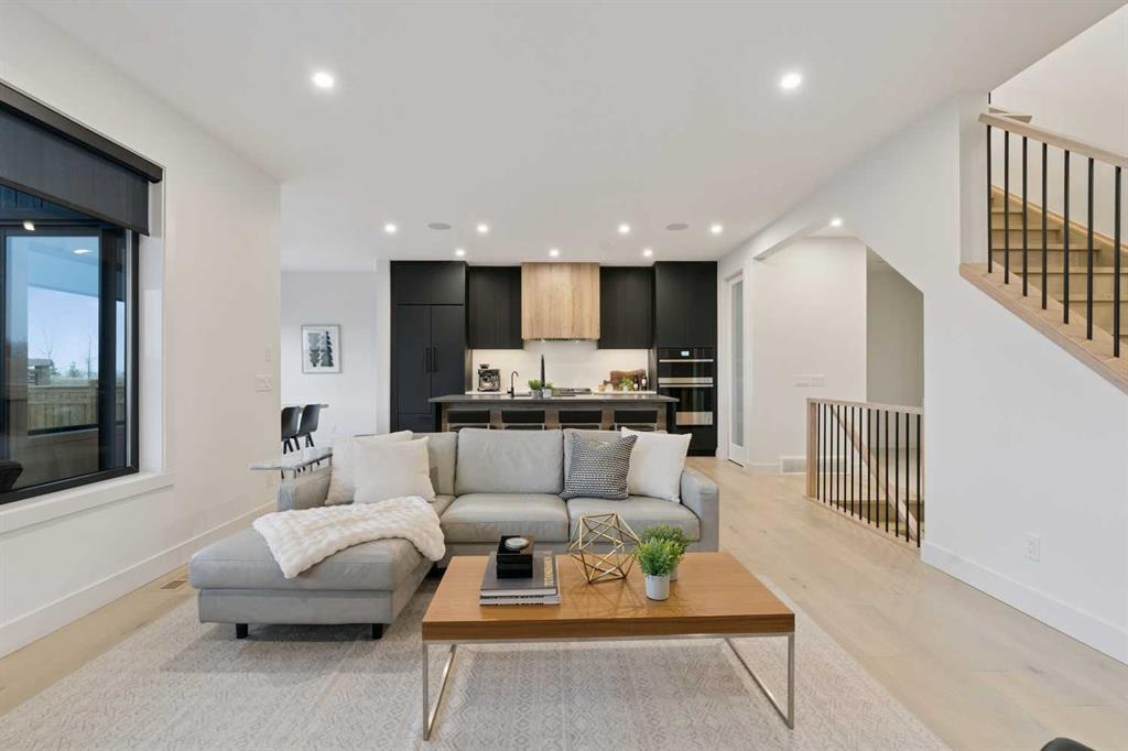 The inviting living room is centred around an oversized gas fireplace with a maple mantle and showcases expansive green views that stretch as far as the eye can see. Built-in speakers throughout the home add to the comfortable and modern living experience.