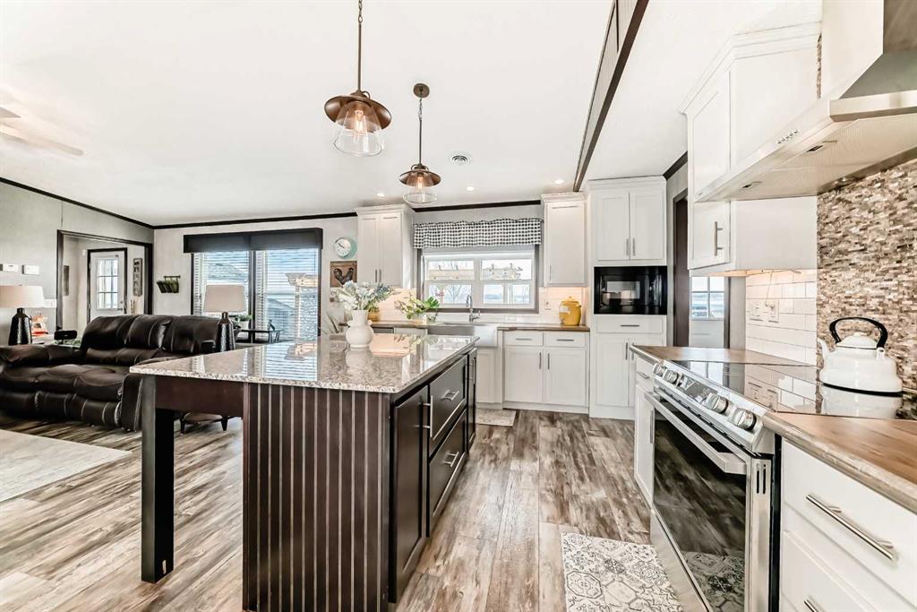 Enjoy peaceful living in Mackenzie Ranch Estates in Lacombe, just minutes from town with easy access to Highway 2! This well-maintained 2017 modular home offers 3 bedrooms, 2 bathrooms, and approximately 1,480 sq ft of living space, all thoughtfully designed with a unique floor plan that stands out in the community. Situated on a great lot that backs onto a field, in a quiet park setting, this former show-home provides comfortable, low-maintenance living while still offering space both inside and out. You’re welcomed into the home by a bright and open layout featuring a spacious living area with a stunning fireplace and built-in shelving that flows seamlessly into the dining space and kitchen. The kitchen offers plenty of cabinetry and counter space, including a large granite island, making it both functional and inviting for everyday living or entertaining. Off the dining area, patio doors lead to the raised deck, providing a great spot to enjoy your morning coffee or relax outdoors. The primary bedroom is privately located and features a large walk-in closet and a spacious ensuite bathroom, creating a comfortable retreat at the end of the day. Two additional bedrooms on the opposite side of the home share a second full bathroom, making this layout ideal for guests, family members, or a home office. Additional features include upgraded lighting, an electric fireplace, a gas BBQ line, and newer stainless steel appliances. The dedicated family room adds even more living space and flexibility within the home. If you’re looking for comfortable living in a quiet community while remaining close to Lacombe and surrounding amenities, this home could be the perfect fit.