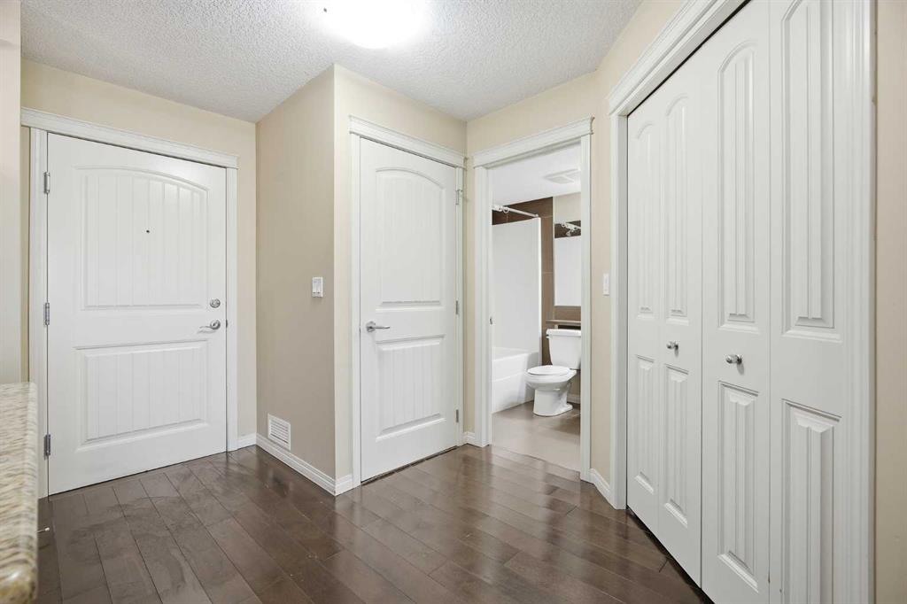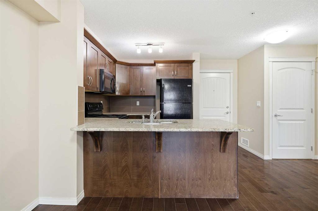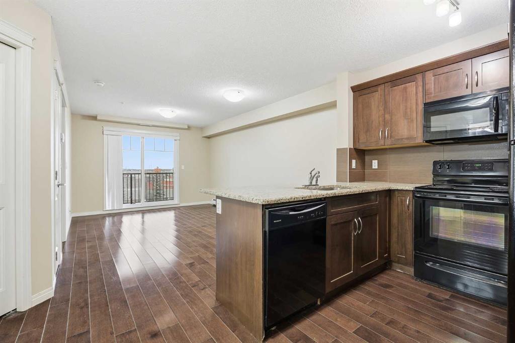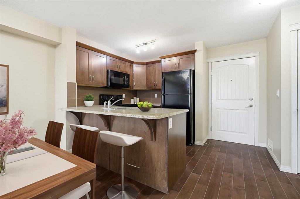 LOWEST PRICED 1 BED / 1 BATH UNIT IN PANORAMA WEST! Experience an elevated lifestyle in this timeless condo located in the heart of Panorama Hills. This modern unit features tall ceilings, warm beige tones, and rich brown laminate flooring throughout. The spacious kitchen is finished with matching brown cabinetry, stainless black appliances, granite countertops, and a large breakfast island—perfect for both everyday living and entertaining. The open-concept living area offers plenty of room to relax and leads to a generously sized balcony through patio doors, allowing for abundant natural light. The well-designed layout includes a spacious bedroom with a large window, walk-in closet, and convenient access to the 4-piece bathroom. Additional highlights include in-unit laundry, a storage locker, and a titled parking stall. Ideally located just steps from shopping centres, schools, and playgrounds, this home is perfect for first-time buyers or investors seeking excellent value in a prime community. Book your private showing today!