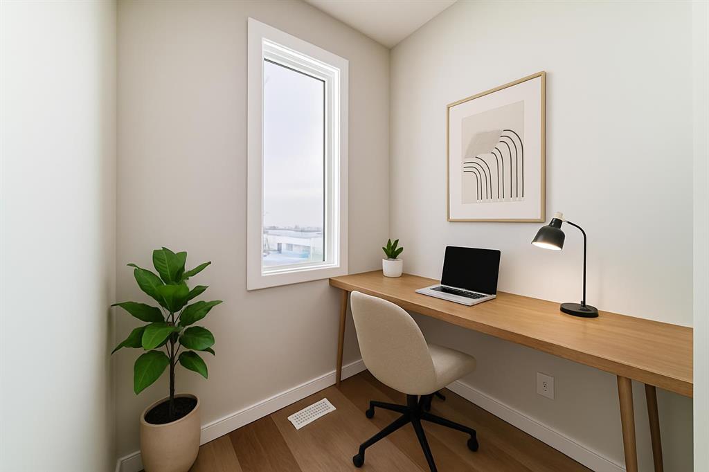 The main floor gets straight to the point. A well-scaled kitchen delivers QUARTZ COUNTERS, 42\" UPPER CABINETRY, A BUILT-IN MICROWAVE, CHIMNEY-STYLE HOOD FAN, and a Silgranit undermount kitchen sink—details that feel elevated without trying to impress anyone but you. The dining and living areas flow naturally, making everyday routines feel easy and entertaining feel unforced. And then there’s the POCKET OFFICE—quietly one of the smartest decisions in the home. Not a corner, not a compromise. A DEDICATED SPACE for work-from-home days, admin, studying, or simply keeping life organized without spreading it across the kitchen table.