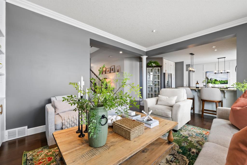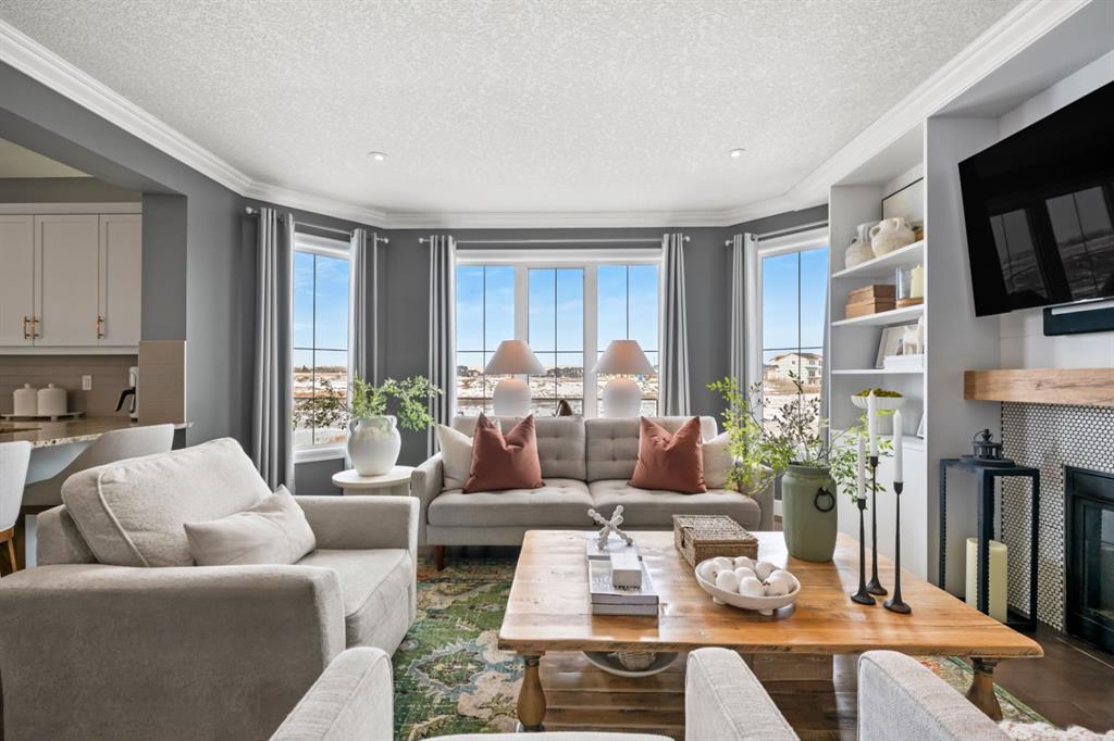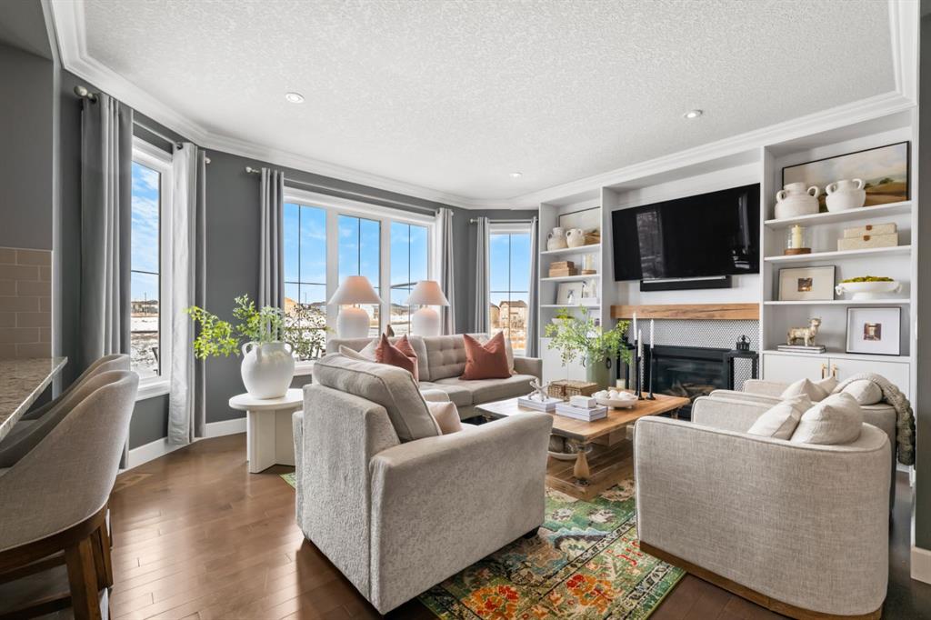 This exceptional executive two-storey walkout home offers over 3,000 sq. ft. of fully developed living space and backs onto a beautiful green space and a scenic pond which provides peaceful views and breathtaking sunsets. A spacious entryway welcomes you inside, where a bright flex room behind French doors creates the perfect home office or reading space. The main level features a sun-filled living room with west-facing windows, a cozy gas fireplace, and custom built-ins.