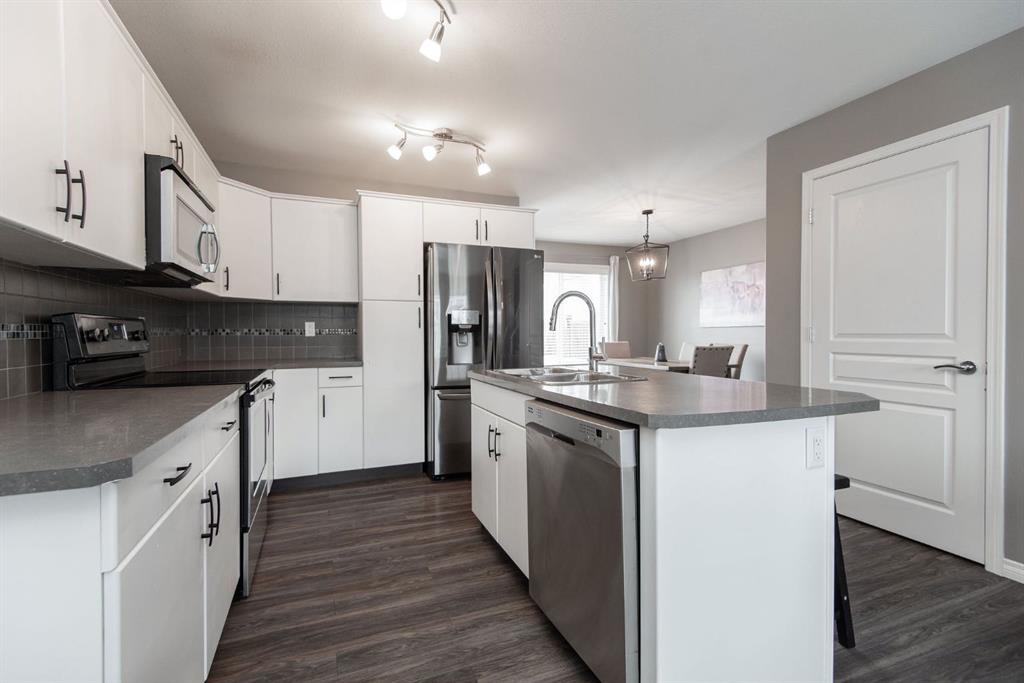 The spacious kitchen is a standout with white cabinetry, upgraded stainless steel appliances, a fully tiled backsplash, and a large island with eating bar—ideal for entertaining or everyday living with separate dinning area. Upstairs you’ll find a comfortable primary bedroom with walk-in closet and 4-piece bath, along with two additional bedrooms and a convenient linen closet. The fully finished basement adds even more living space with a large family room, an additional bedroom, and a 3-piece bathroom featuring a custom tiled shower.