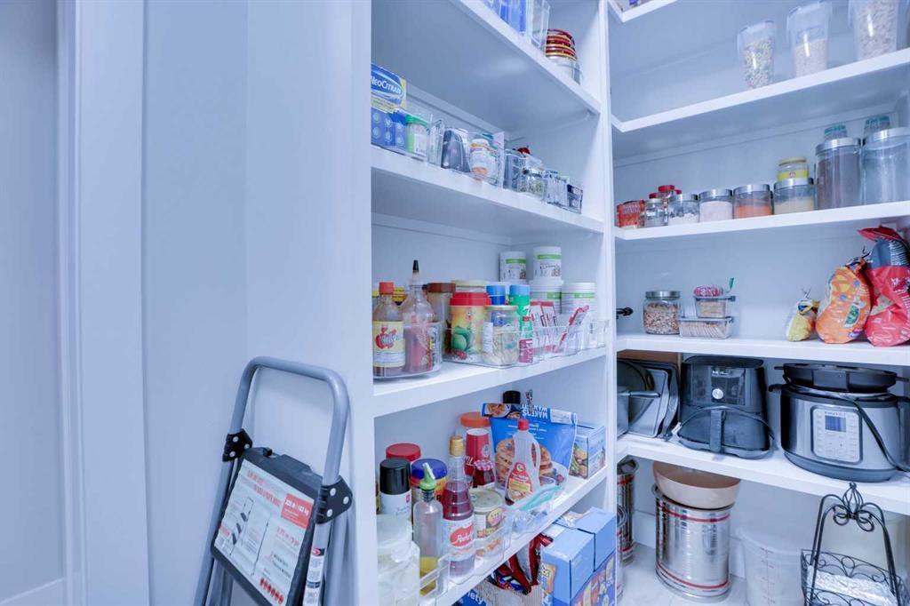 The gourmet kitchen is a true centerpiece, featuring quartz countertops, full quartz backsplash, oversized island, gas stove, oversized refrigerator, two-tone cabinetry, and custom wood detailing. A walk-through pantry connecting the kitchen and mudroom adds everyday convenience. The main floor also includes a bedroom and a full 4-piece bathroom, perfect for guests, extended family, or a home office.