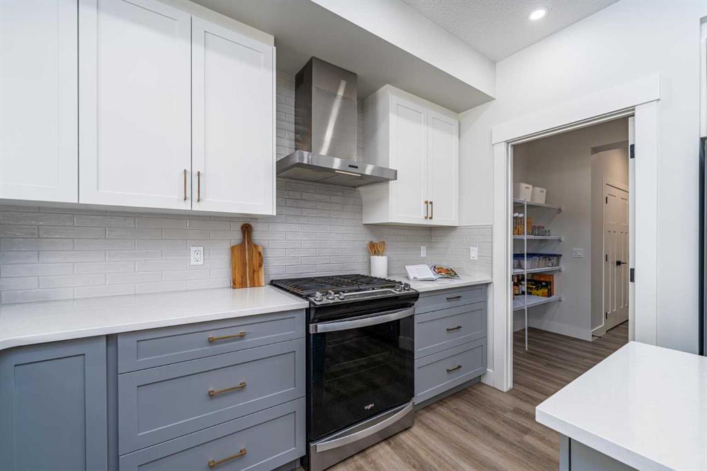 The main floor features a bright and spacious office, perfect for working from home. The modern kitchen is designed for both everyday living and entertaining, featuring a huge island, gas stove, and a large walk-through pantry conveniently connected to the garage.