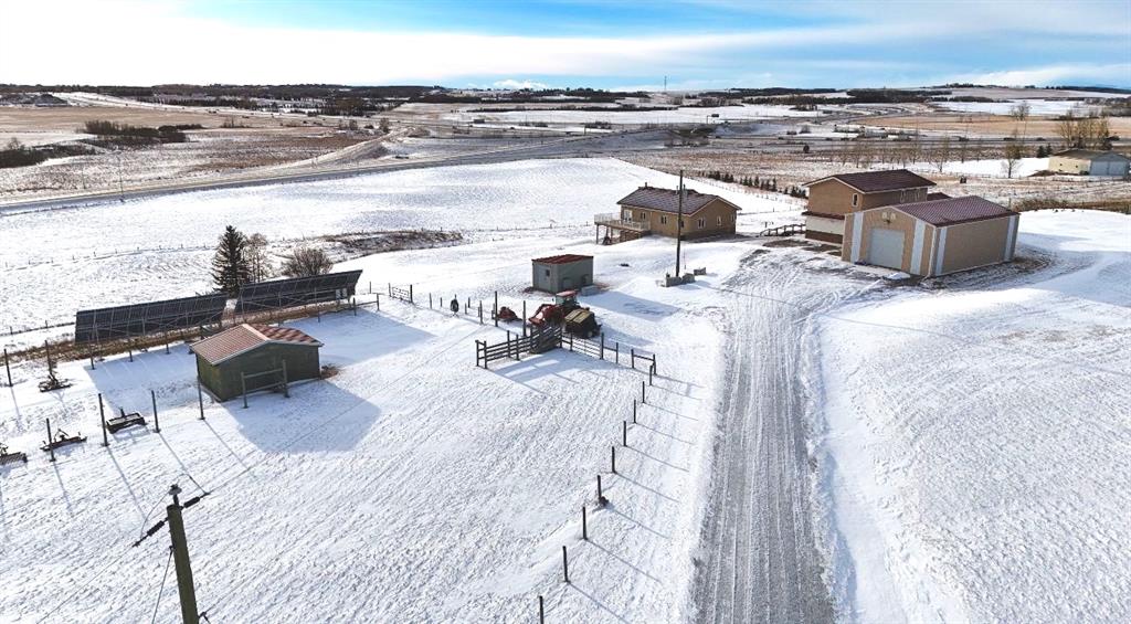 ** OPEN HOUSE Sunday March 15th 2pm-4pm ** Amazing 24 acres with 3 bed walk out bungalow and rare commercial infrastructure (almost 4,000sf), located just minutes south of Calgary! Perfectly situated with easy access to Okotoks, and High River too. Previously a licensed retail operation for 14 years with a purpose-built COMMERCIAL COMPLEX. Suitable for a VARIETY OF BUSINESSES or live/work uses (subject to County approval). Land is cross fenced, hayed annually, and offers SUBDIVISION POTENTIAL (subject to approval). Exceptional water security includes year-round headwater spring feeding three interconnected ponds with registered agricultural water rights, a well, septic tank and 3,000-gallon cistern, multiple hydrants, and stock waterer. Power systems include Fortis power (25kVA), Kubota diesel standby generator (22kVA) with auto start, and 19.8 kWp solar array producing approx. $3,200/year in electrical savings. Property includes PRIMARY RESIDENCE (walkout 3-bedroom bungalow) and Commercial Complex with connected 2-STOREY building with fire-rated doors and dedicated exterior exit, a 1-storey building, and shop/warehouse with 12’ x 12’ overhead door (immaculately maintained and clean). Buildings have hydronic heating with HEATED CONCRETE FLOORS, A/C and hail-resistant roofing. SECONDARY SUITE potential (subject to approval). Other property features include a powered hay shed, gated entry with power, monitored security, stunning views and school bus access. A rare, infrastructure-rich opportunity close to Calgary.
