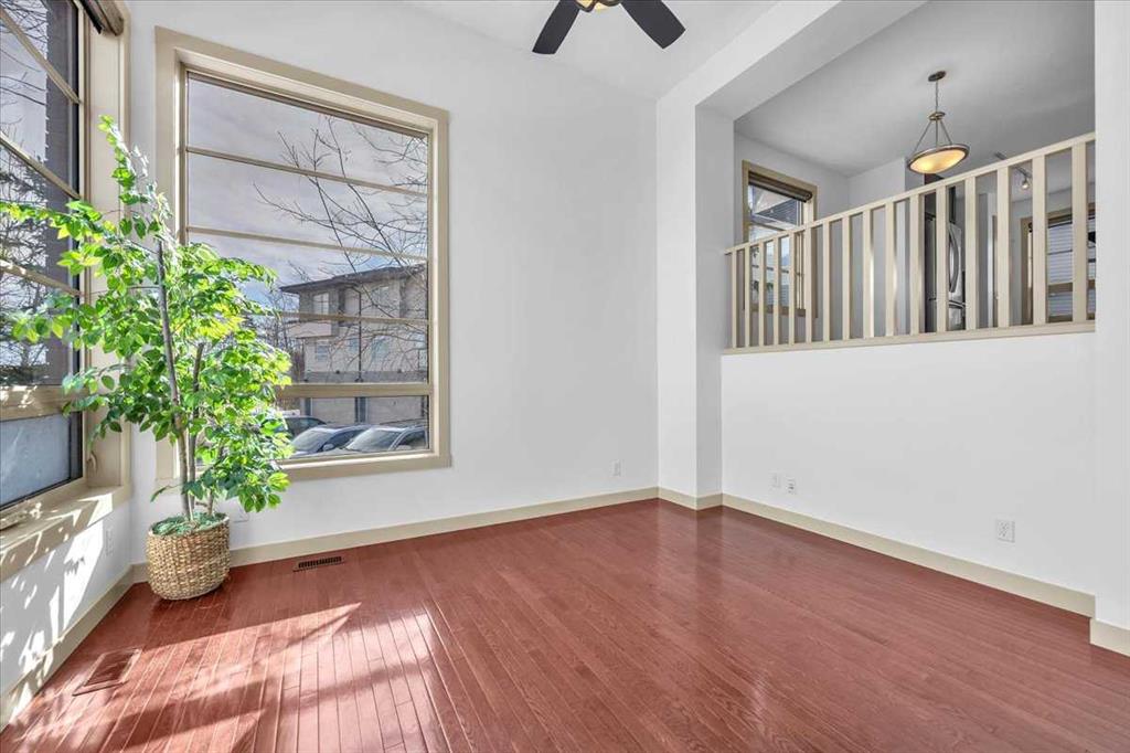 The open-concept main floor is highlighted by dramatic two-storey windows that flood the home with natural light. The spacious kitchen features granite countertops, stainless steel appliances, a pantry, ample cabinetry, desk area, and a large eat-up island perfect for casual dining or entertaining. The adjacent dining area provides flexible space for hosting or everyday living. Hardwood flooring runs throughout the main and second level, adding warmth and elegance.