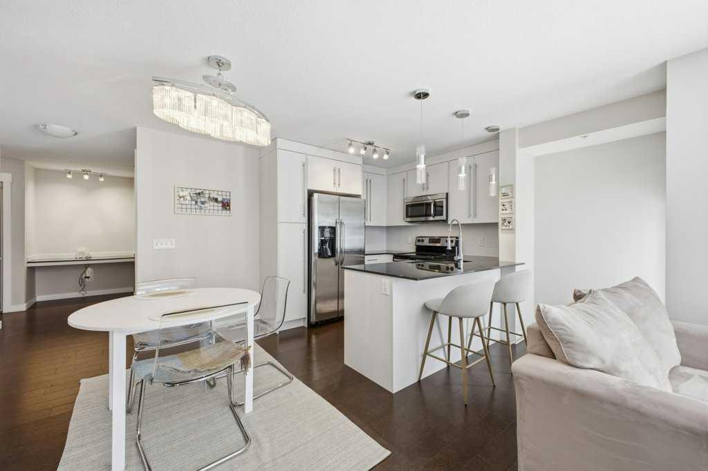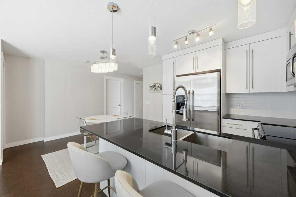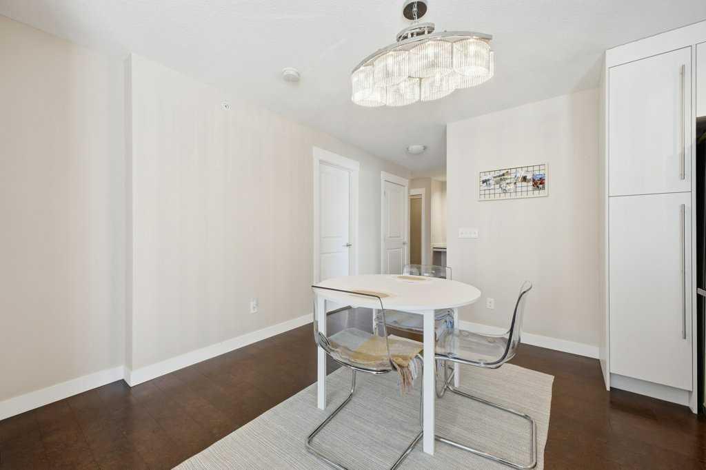 This is a top-floor corner unit and that matters. No one above you, no noise from the hallway on two sides, and windows wrapping the south, southeast, and southwest. Natural light from morning through evening. It\'s one of the quieter positions in the building, and one of the larger floor plans available. The living room is generous for a condo this size. There\'s room for a proper sofa, a coffee table, and still space to move around. The cork flooring runs through the main living areas. It\'s softer underfoot than hardwood and keeps the space feeling warm. This isn\'t a unit where you feel like you\'re living in a box. The corner layout gives you that extra breathing room that most condos in this price range just don\'t have. The kitchen sits open to the living and dining area with no walls cutting it off and no awkward transition. Upgraded appliances, a microwave hood fan above the stove, good counter space, and enough cabinetry to actually store things. The layout is practical and the flow makes sense whether you\'re cooking for one or having people over. There\'s also a built-in desk just off the kitchen area, It keeps a workspace tucked in without eating up a whole room. The dining area sits between the kitchen and the living room, big enough for a full table and chairs, with natural light coming in from multiple directions. Morning coffee here with the south sun coming through is a pretty good way to start a day. The primary bedroom comfortably fits a king bed with nightstands on both sides and still leaves you room to move. Dual closets mean storage isn\'t an issue. The 4-piece ensuite is off the primary and well-sized. It\'s your own bathroom, private to the bedroom, which matters when you have guests or a roommate using the second bath. The second bedroom is also a solid size, fits a queen easily, and works just as well as a home office or flex space if you don\'t need the second bedroom full time. It has direct access to the second full 4-piece bathroom in the hall. In-suite laundry is included, washer and dryer in the unit. Step out onto the south-facing balcony. You\'ve got south and west exposure, which means afternoon and evening sun. One titled, heated underground parking stall is included. Assigned storage locker also included, separate from the unit, on the parkade level. Condo fees cover heat, water. Electricity is the only utility you\'re paying separately. Outside the front door, you\'re in Mahogany, one of the few lake communities in Calgary where the lake access is actually good. Residents get two beaches, the Beach House, tennis courts, a skating rink in winter, and over 35 km of pathways that wind through the wetlands. It\'s a community where people actually use the amenities. Seton is a short drive with a grocery store, restaurants, coffee shops, a Cineplex, and South Health Campus all within a few minutes. Deerfoot and Stoney Trail are both easily accessible.