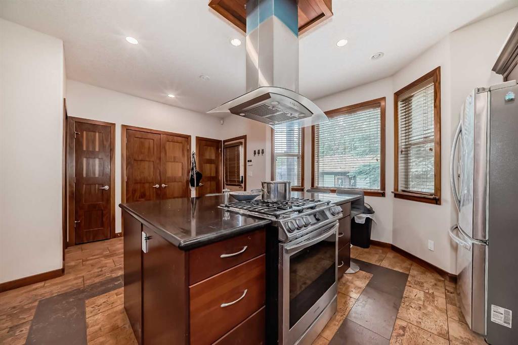 Upstairs, a curved staircase leads to the master suite, a tranquil retreat complete with a custom walk-in closet, private balcony with sunset views, and a luxurious 5-piece ensuite featuring a skylight, double vanity, soaker tub, and separate shower. Two additional bright and spacious bedrooms share this level, along with a conveniently located laundry area. The finished basement offers additional living space with a rec room for movies and games, a fourth bedroom, another full bathroom, and ample storage. Outside, the west-facing backyard is perfect for enjoying sunny days on the full-width deck, surrounded by mature trees and a fenced grassy yard ideal for family activities. An insulated double detached garage provides parking convenience. Close to School, transit, shopping easy access to Centre street and 4th Street. Call to view before it\'s gone!.