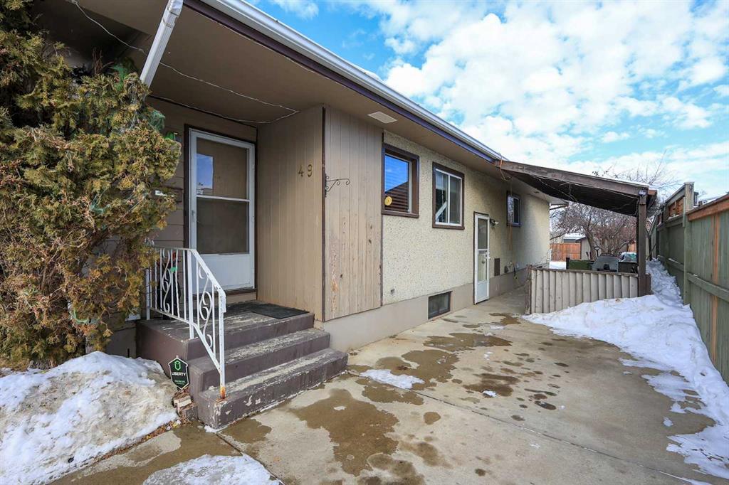 FULLY DEVELOPED 4 BEDROOM, 2 BATHROOM SEMI-DETACHED BUNGALOW ~ EXTRA LONG FRONT DRIVEWAY & REAR PARKING PAD ~ FACING A TREED GREEN BELT ~ Open concept main floor layout complemented by laminate floors ~ The living room features a large west facing picture window that overlooks the front yard and treed green belt ~ The kitchen offers a functional layout and plenty of white shaker cabinets, ample counter space, stainless steel appliances and large south facing windows that fill the space with natural light ~ Side entry has access to the covered patio and offers a separate entry to the basement ~ 3 bedrooms on the main level are all a generous size with ample closet space ~ 4 piece main bathroom with a large linen closet in the hall beside ~ The fully finished basement offers a large family room with a brick faced fireplace, 4 piece bathroom, 4th bedroom, storage room with built-in cabinets, and laundry ~ The backyard is landscaped with mature trees and shrubs, has 4 free trees (apple, crab apple, choke cherry and plum), has a garden shed and is partially fenced ~ Rear parking pad with space for at least two vehicles plus an extra long poured concrete front driveway ~ Located steps to walking trails, parks, playgrounds, schools, Bower Ponds, Great Chief Park, and more with easy access to downtown and the highway.