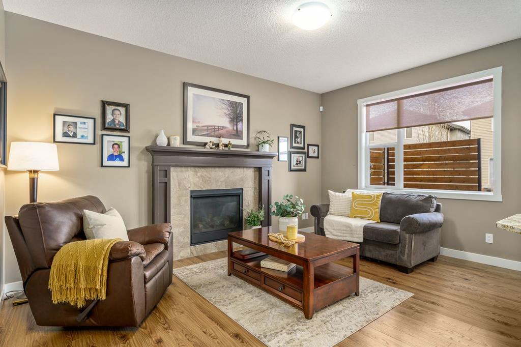 The bright open-concept main floor is designed for comfortable everyday living and entertaining. Large windows fill the home with natural light while durable laminate plank flooring and recessed lighting add warmth and modern style throughout. The kitchen is a standout, featuring rich mahogany cabinetry, granite countertops, stainless steel appliances, a central island with bar seating, and a spacious pantry. The living room is anchored by a custom fireplace mantel with tile accents, creating a natural gathering space. A practical mudroom and main floor laundry are conveniently located just off the garage.