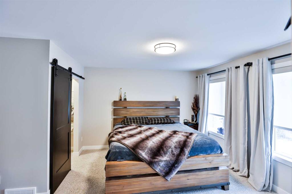 Upstairs, the spacious primary suite offers an amazing ensuite with a walk-in tiled shower with glass door, floating vanity with quartz countertop and undermount sink, private toilet room, and a large walk-in closet with wire shelving and custom black barn doors. The upper level also includes a second bedroom, full bathroom, and a convenient hallway nook perfect for a desk or workspace.