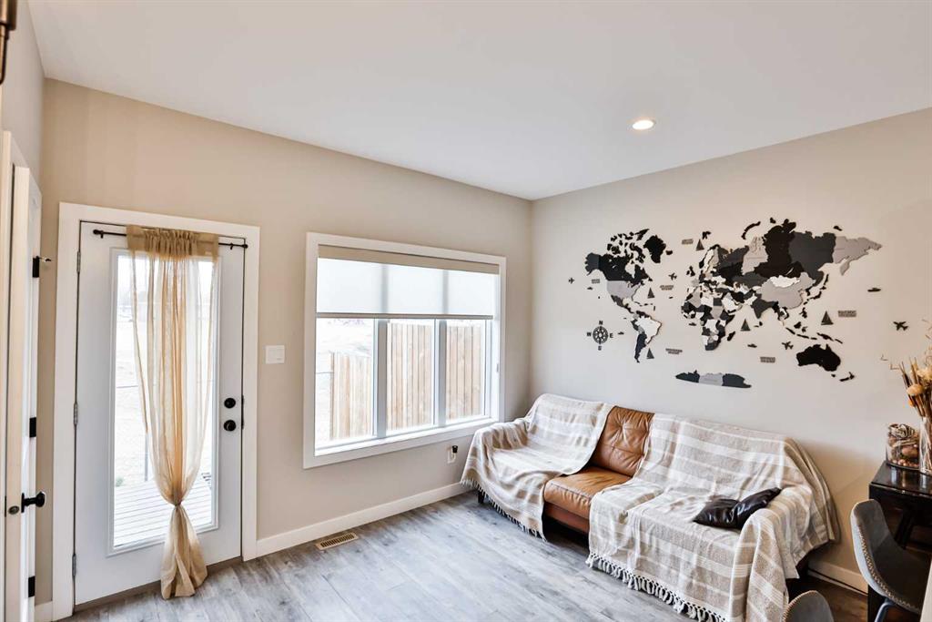 The quaint living room opens onto a back patio with wood deck and gazebo, perfectly positioned to take in the stunning coulee views — an ideal place to relax or entertain while enjoying the surrounding natural landscape.