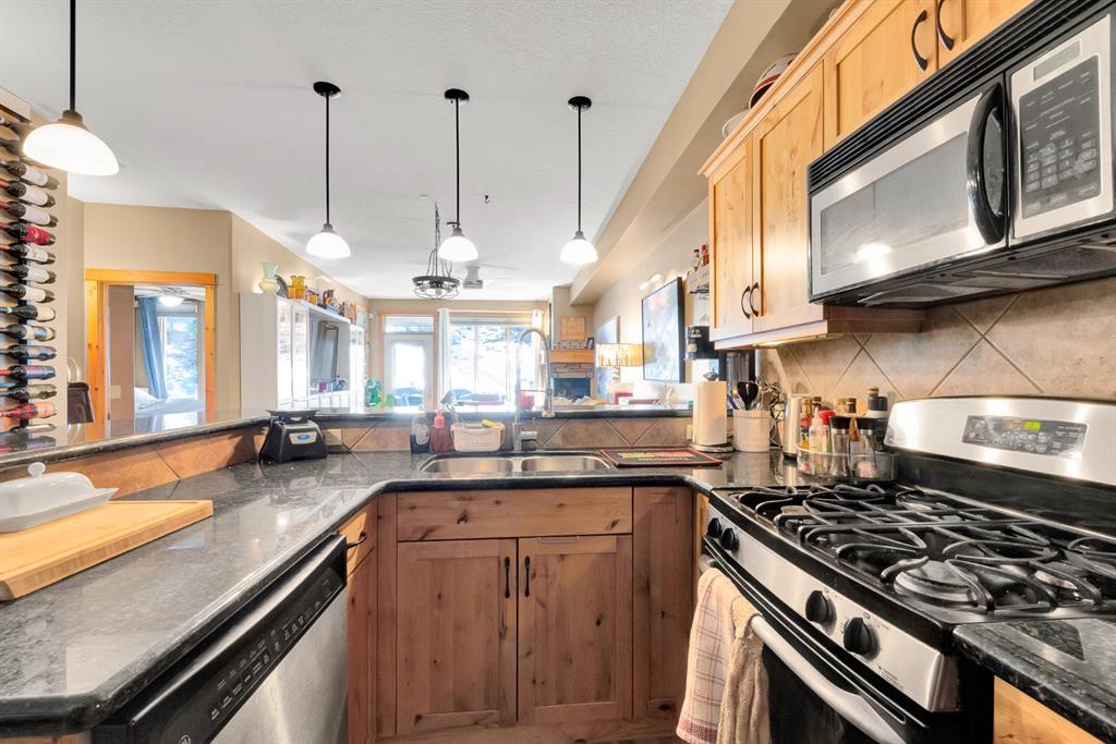This 2 bed, 2 bath home in Canmore’s sought after Three Sisters community offers the perfect mix of comfort, function, and location. Inside, you’ll find exposed wood cabinetry, solid stone countertops, and matching wood trim, doors, and vanities that give the home a clean, mountain feel. The open layout includes a gas fireplace with exposed rock and a wooden mantle, plus loads of natural light and a primary suite with a 3 piece ensuite and walk in closet. Heated linoleum floors with in-floor radiant water heating keep things efficient and warm year round. Step outside to your private patio with a built in gas BBQ, great for winding down after a day in the mountains or entertaining friends and family. This unit comes with two heated, secured underground parking stalls and a large heated storage unit for all your gear. You\'re minutes to Stewart Creek Golf Course, downtown Canmore’s restaurants and shops, and right next to a network of hiking, biking, and walking trails. Banff National Park is just 15 minutes away, with four major ski resorts - Norquay, Sunshine, Nakiska, and Lake Louise, all within a 40 minute drive. A clean, well-kept home in a prime location - ready for full time living or a mountain escape.