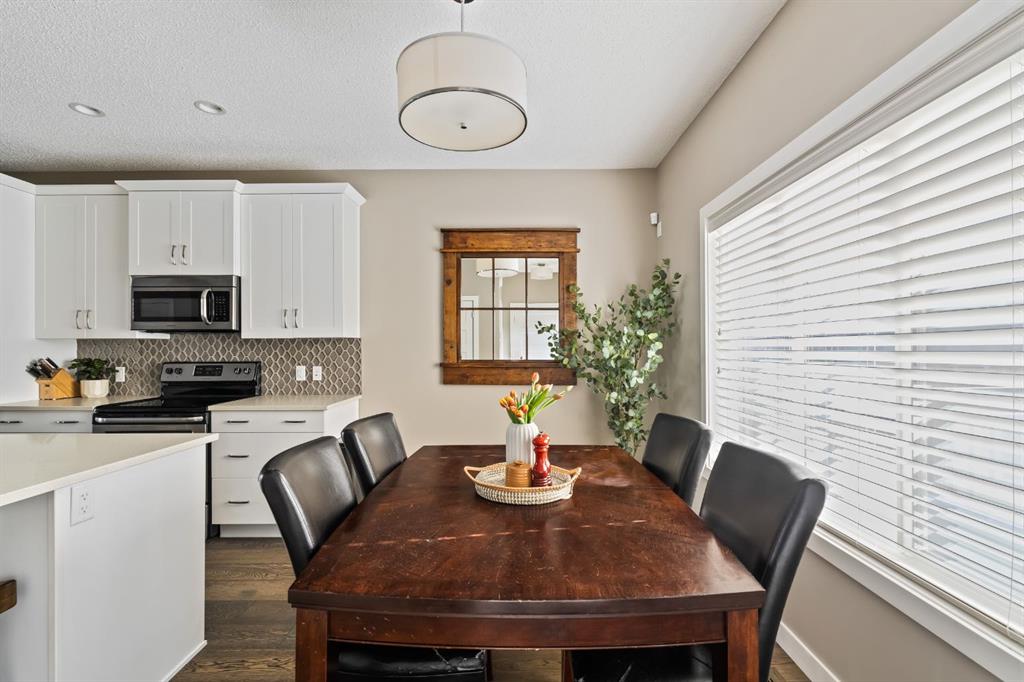 Welcome to Walden, a family-friendly and easily accessible southeast Calgary community! This former Cardel-built show home offers 3 bedrooms, 2.5 bathrooms, and 1,345 sq. ft. of beautifully designed living space. As you approach the home, you’ll appreciate the landscaped front yard, the attractive aggregate walkway leading to the front entrance and the upgraded Hardie board siding on the exterior. Inside, the bright and inviting main floor features 9’ ceilings, engineered hardwood flooring, and a functional open-concept layout ideal for both everyday living and entertaining. The modern kitchen is a standout with quartz countertops, stainless steel appliances, glass tile backsplash, a large central island, and contemporary finishes. A generously sized pantry provides excellent storage for food and small appliances. Completing the main floor is a conveniently located powder room with an upgraded vanity. Upstairs you’ll find the convenience of upper-floor laundry and three well-appointed bedrooms, including a comfortable primary retreat featuring a walk-in closet and a 4-piece ensuite. An additional 4-piece bathroom serves the secondary bedrooms. Downstairs the finished stairwell leads to the full unfinished basement, offering excellent potential for future development. The mechanical system is neatly positioned in the back corner, making it easy to maximize the remaining space. Step outside through the rear entrance to enjoy the oversized deck, perfect for summer entertaining.The south-facing, fully fenced backyard offers plenty of green space to relax or for pets to play. Additional features include fresh paint, central A/C, Hunter Douglas blinds, central vacuum, and a detached double garage.The home is finished with a modern exterior elevation and stylish design selections throughout, creating a polished and move-in-ready feel. Walden is surrounded by beautiful parks, playgrounds, scenic pathways, golf courses, and nearby amenities in Legacy. With quick access to MacLeod Trail, Deerfoot Trail and Stoney Trail, commuting anywhere in the city is simple while still enjoying the charm of a connected community!