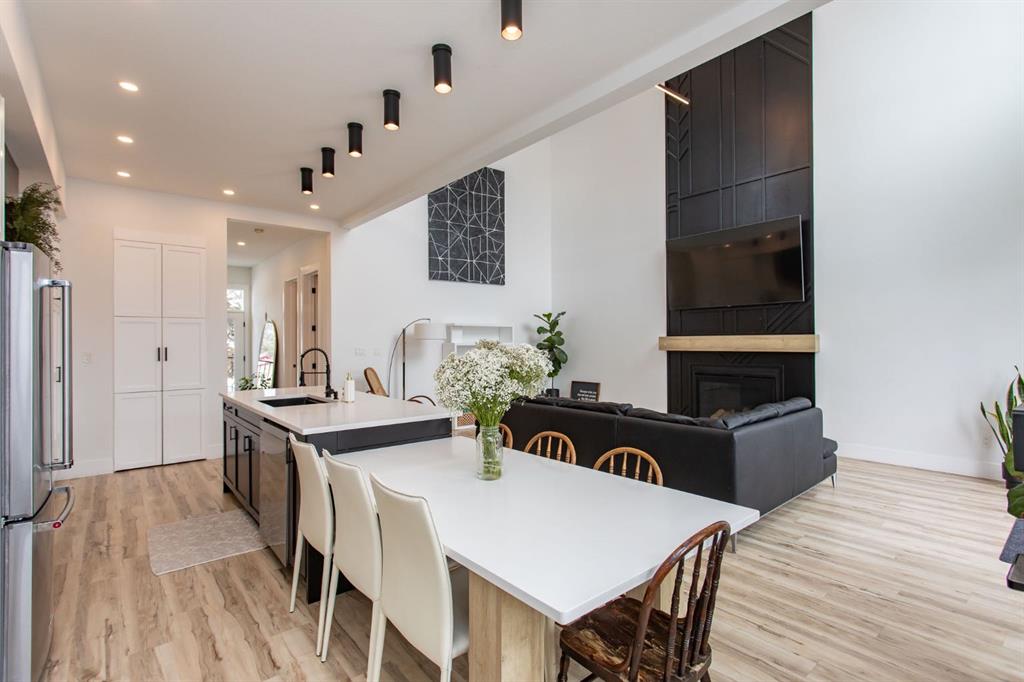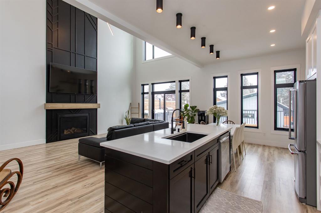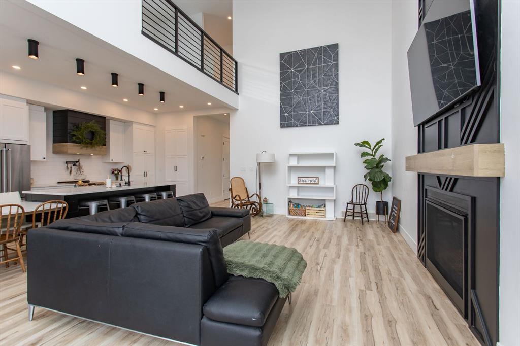 Step inside the upper suite and experience a bright, open-concept layout defined by soaring ceilings, expansive windows, and premium finishes throughout. The heart of the home is a designer kitchen featuring quartz countertops, sleek white cabinetry, stainless steel appliances, and an oversized black island—perfect for both entertaining and everyday living. The inviting living room is anchored by a stylish gas fireplace, creating a warm yet sophisticated atmosphere.