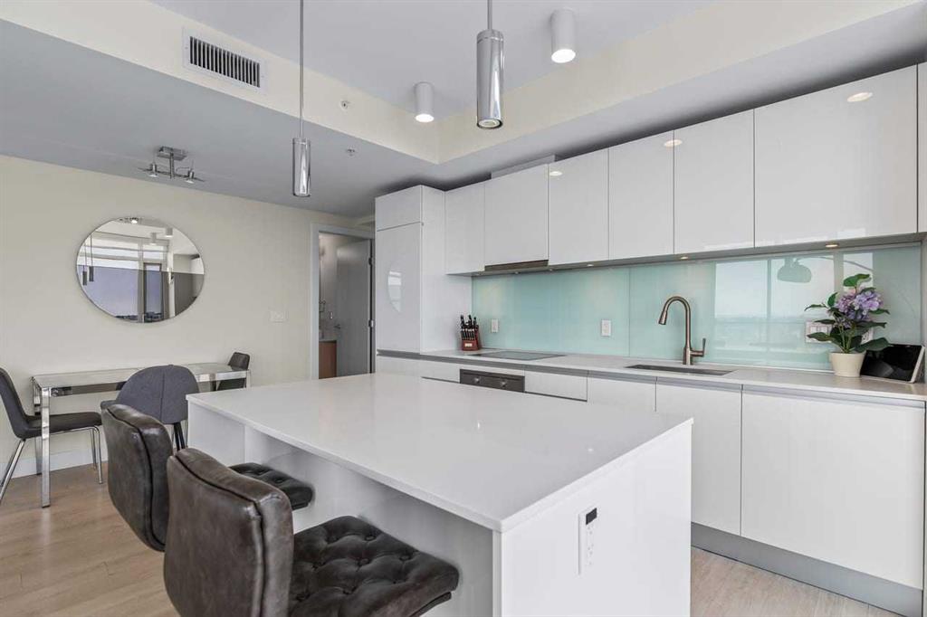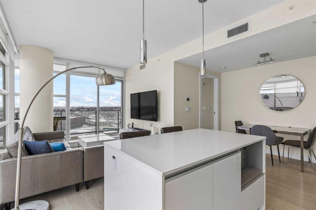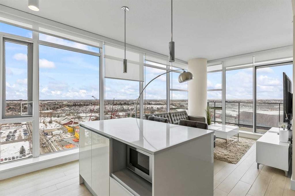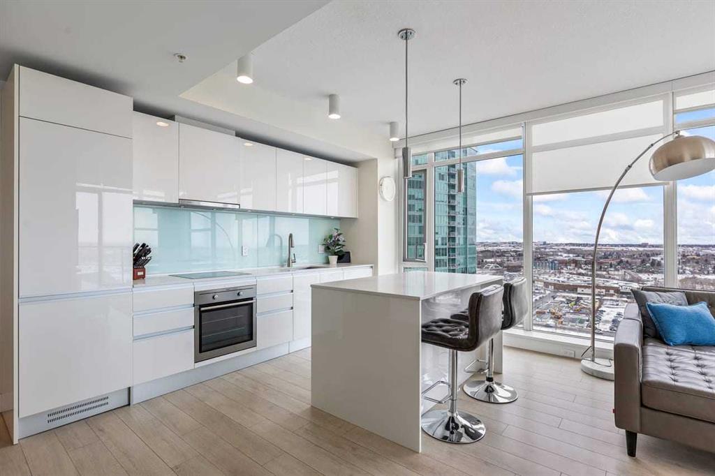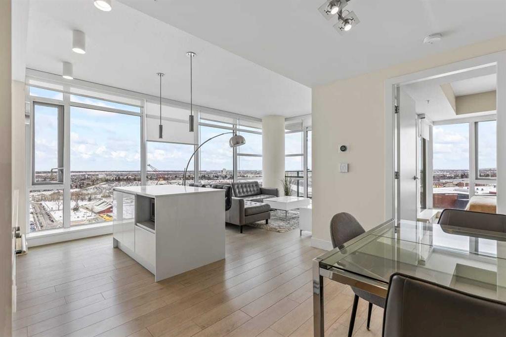 Experience LIMITLESS SKY-HIGH VIEWS in this SUN-DRENCHED CORNER 2 BEDROOM, 2 BATHROOM residence perched on the 21st floor of The GUARDIAN SOUTH. This sophisticated home is defined by its PRIME ELEVATION and a private balcony that offers a front-row seat to the city below. The well-proportioned open-concept living area showcases two full walls of floor-to-ceiling windows, framing breathtaking sunsets over the Rocky Mountains, the glittering Calgary skyline, and incredible views of the Stampede fireworks.