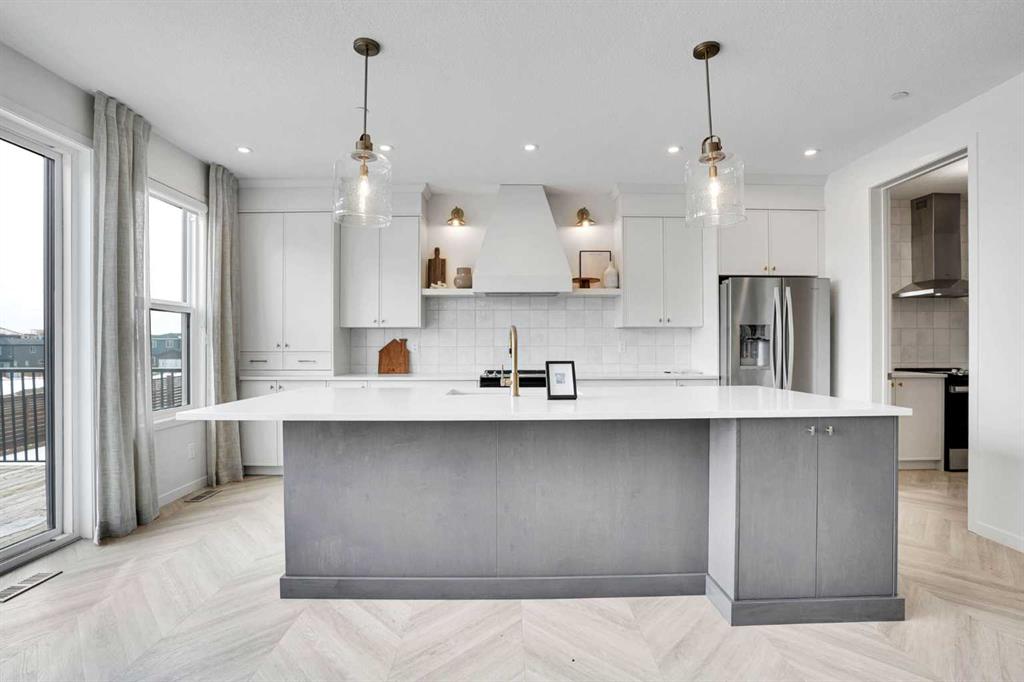Nestled in the vibrant and family-friendly community of Livingston, this stunning former show home built by Cedarglen Homes has never been lived in and showcases exceptional craftsmanship, high-end upgrades, and thoughtful design throughout. Step inside to discover a bright open-concept main floor featuring soaring 8’ interior doors, luxury vinyl plank flooring, and elegant finishes that create a warm yet sophisticated atmosphere. Huge windows throughout the open-concept living space bring in an abundance of natural sunlight, creating a bright and welcoming environment. The inviting living room features a beautiful vertical shiplap feature wall with a tiled electric fireplace, blending modern style with cozy comfort. The chef-inspired kitchen is both functional and impressive with quartz countertops, two-tone cabinetry, a large central island, and in addition to the main kitchen, there is a separate spice kitchen that provides extra prep and cooking space. The dining nook opens onto an oversized deck, perfect for summer BBQs, entertaining guests, or relaxing outdoors. A main floor bedroom and full bathroom provide flexibility for guests, a home office, or multi-generational living. Upstairs, the primary retreat offers a spa-inspired ensuite with a custom tiled shower, soaker tub with tile ledges, dual sinks, quartz countertops, and a spacious walk-in closet, while three additional generously sized bedrooms provide plenty of space for family or guests. The upper level also includes a convenient laundry room and a beautiful, cozy bonus room ideal for relaxing or spending time with family. Every detail of this home reflects quality and thoughtful upgrades, including upgraded lighting, designer hardware, and an installed security system. Outside, enjoy the completed oversized deck while taking in the peaceful surroundings of Livingston. Residents also enjoy access to the impressive Livingston Hub, a state-of-the-art facility featuring a skating rink, splash park, gymnasium, tennis courts, and event spaces, along with numerous parks, playgrounds, and pathways throughout the neighbourhood, with convenient access to Stoney Trail and Deerfoot Trail for easy commuting. Move-in ready and never lived in, this exceptional show home offers the perfect combination of designer elegance, everyday functionality, and outstanding value.