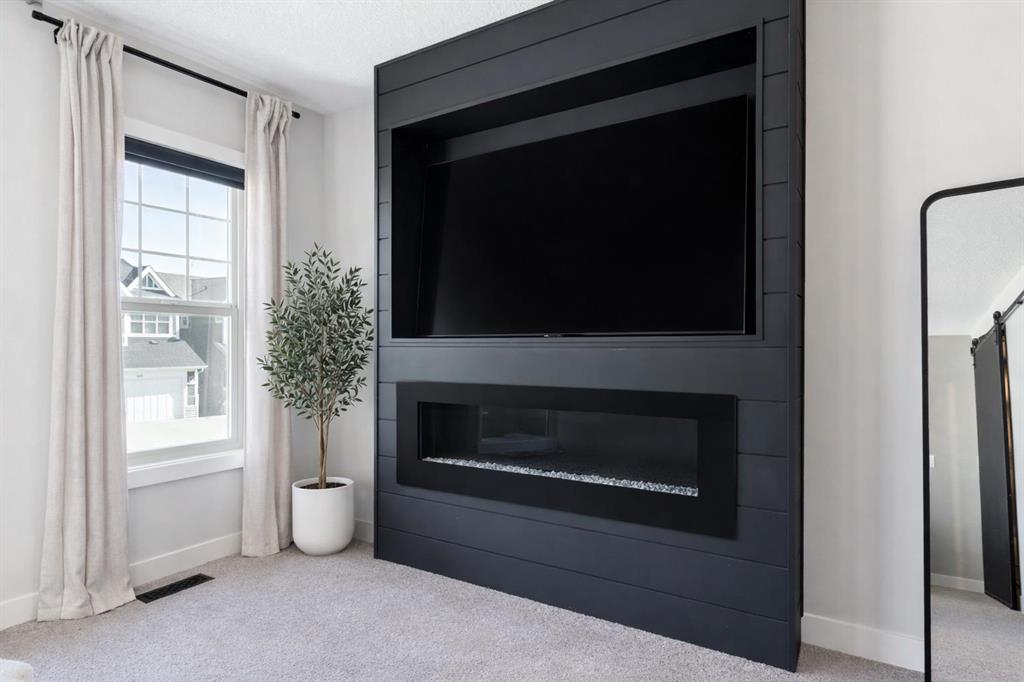 Upstairs, a bright bonus room with CUSTOM FEATURE WALLS provides flexible living space. The west-facing kids’ bedrooms offer cozy SHIPLAP DETAILS, while the primary bedroom is a luxurious haven—complete with its own FIREPLACE, TINTED WINDOWS, AUTOMATIC BLINDS, and a spa-like 5-PIECE ENSUITE with soaker tub, tiled shower, and a WALK-THROUGH CLOSET with BARN DOOR and CUSTOM ORGANIZERS.