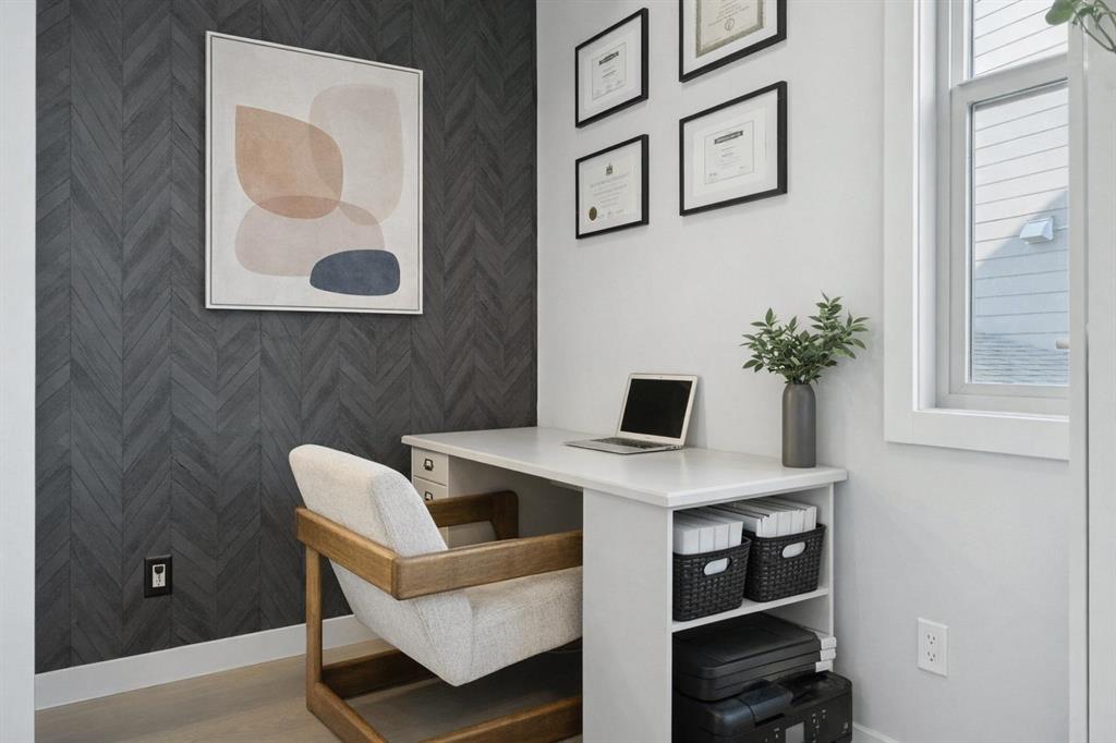 A bright OPEN-TO-BELOW foyer welcomes you with expansive windows and beautiful EXPOSED CEILING BEAMS that highlight the home’s architectural charm. The main floor offers a dedicated OFFICE, a stylish powder room, and added ease with the NEST SMART SYSTEM. The gourmet kitchen serves as the centrepiece, showcasing UPGRADED APPLIANCES, a gas cooktop with chimney hood fan, an oversized island, and STRIKING FEATURE WALLS. The adjoining living room is warm and inviting with its GAS FIREPLACE and airy, light-toned finishes.