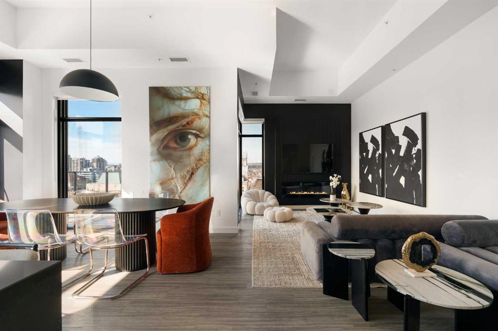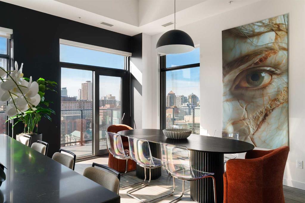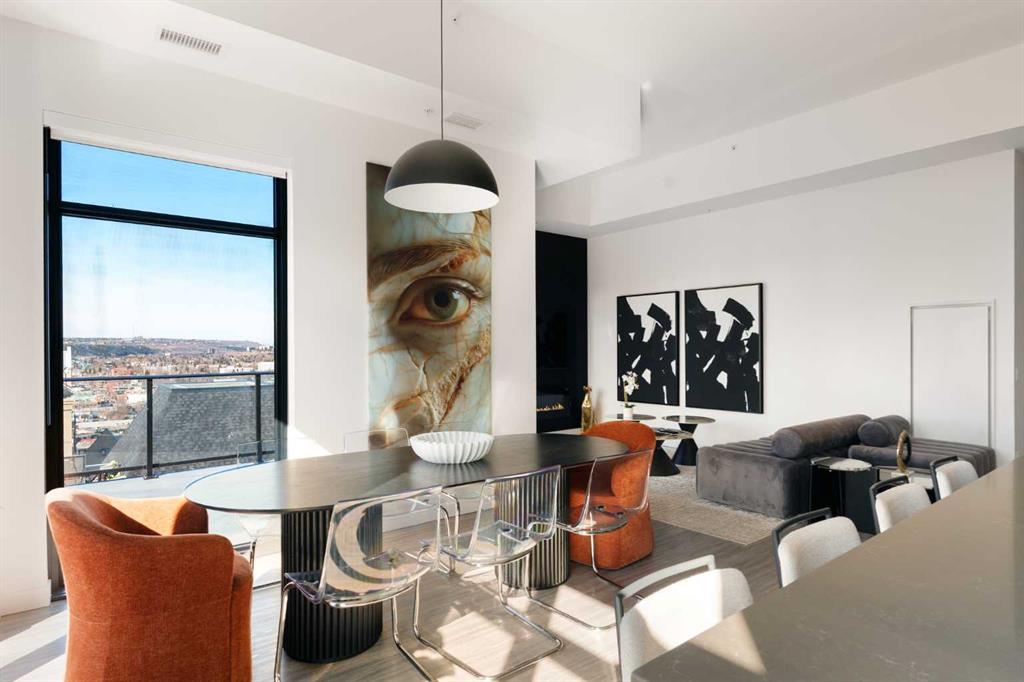 Experience elevated urban living in this luxury penthouse in Downtown Calgary, offering a rare combination of breathtaking views, modern design, and premium finishes. This exceptional 2 bedroom + den, 2 bathroom condo is thoughtfully designed with a seamless open-concept layout that connects the living, dining, and kitchen spaces—perfect for both entertaining and everyday living.