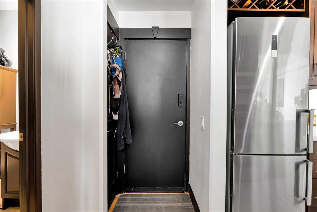 Inside, you’ll find hardwood floors, modern light fixtures, and crisp white walls contrasted by striking black trim and doors, creating a contemporary feel. The functional kitchen features stainless steel appliances, epoxy counters, under-cabinet lighting, and a convenient breakfast bar, making it perfect for both everyday living and entertaining. The bedroom is accessed through elegant double doors, adding character while maintaining an open, airy layout. The unit benefits from insuite laundry, a dishwasher, microwave hood fan, and newer energy efficient vinyl windows- plus there is a seperate dedicated storage locker. ***