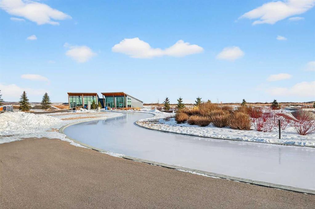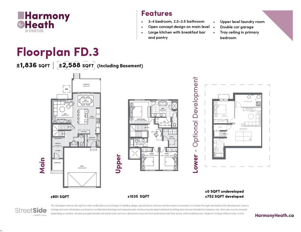 Experience the height of sophisticated living in this highly coveted luxury townhome, where a generous floor plan meets modern comfort and refined finishes. Proudly presented by StreetSide – this thoughtfully designed unit features 3 bedrooms, 2.5 bathrooms, and a front attached double car garage. The heart of the home is a spacious kitchen with a large central island, polished white quartz countertops, upgraded stainless steel appliances, and elegant sliding French patio doors that open to your covered deck area—ideal for both everyday living and entertaining. Light floods into the living room with ease through the large window, while luxury vinyl plank flooring flows throughout the main floor living areas, and carpeted stairs leading to the upper level and bedrooms provide extra warmth. The primary ensuite is a private sanctuary, complete with tile flooring, double sinks, a freestanding soaker tub, and an oversized tile-and-glass shower delivering spa-inspired comfort at home. The unfinished basement with roughed-in plumbing provides future potential for additional living space tailored to your needs. Professional landscaping and fencing complete your new home. Ideally located in the award-winning community of Harmony, residents enjoy Mickelson National Golf Course, private lake amenities, scenic walking and biking trails, and a wellness-focused lifestyle—just a shorty drive from Calgary city minutes and 45 minutes from the Rocky Mountains, where nature and convenience come together effortlessly