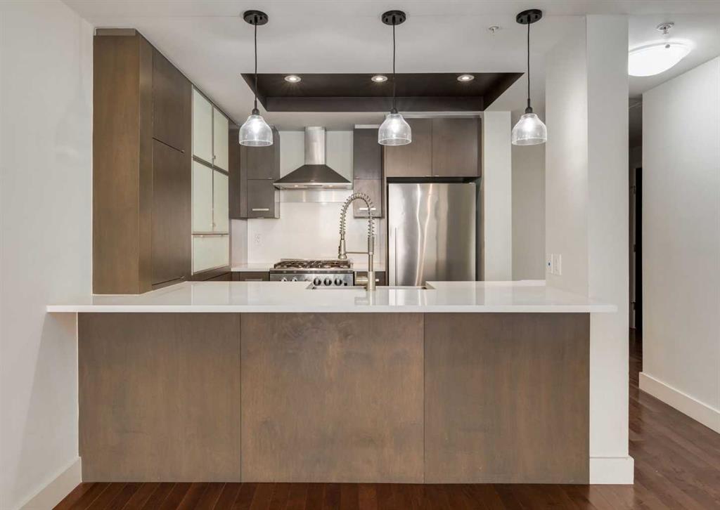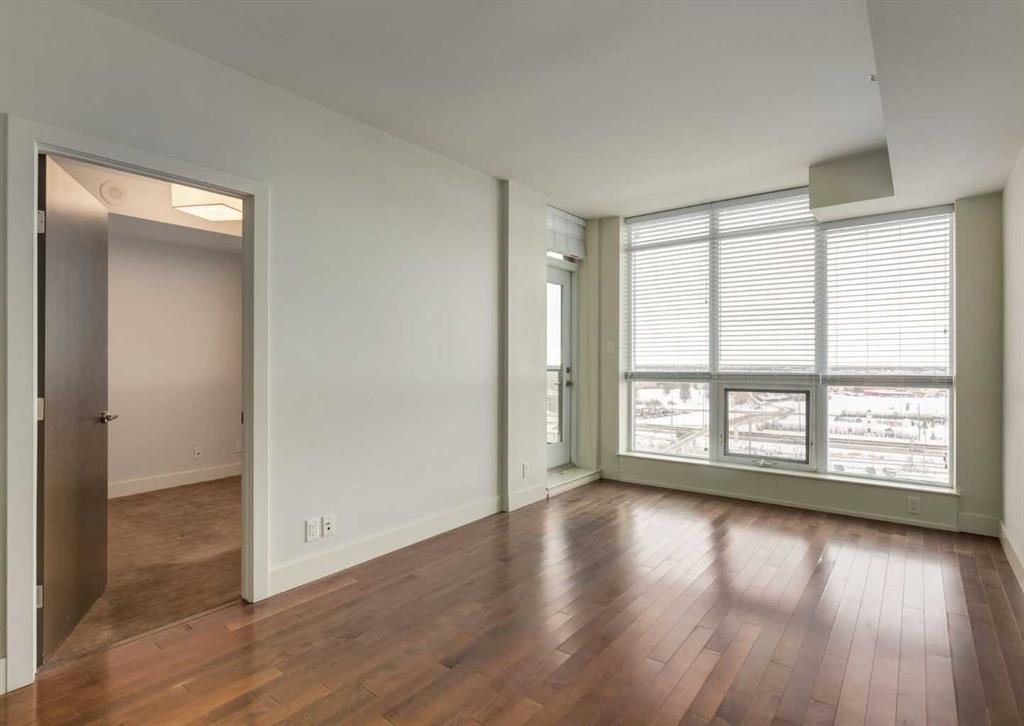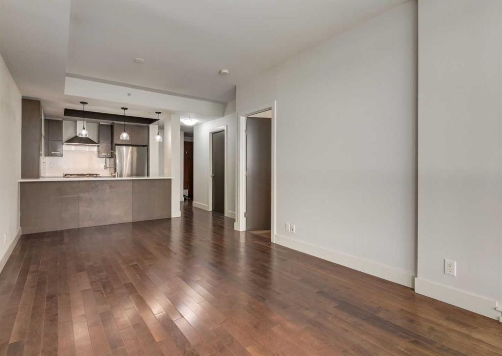 Welcome to The Highbury, where modern style meets everyday convenience. This beautifully designed unit features soaring ceilings, rich hardwood flooring, and stunning floor-to-ceiling windows that fill the space with natural light while showcasing unobstructed east-facing views. The contemporary kitchen is thoughtfully appointed with quartz countertops, a farmhouse-style double sink, gas range, sleek double drawer dishwasher, and a breakfast bar perfect for casual dining or entertaining. Step onto your private balcony to enjoy beautiful sunrise views, complete with a natural gas BBQ hookup for outdoor cooking. On cooler days, relax in the bright living room and take in the same impressive views from inside. The functional layout includes a welcoming entry with a storage closet, in-suite stacked washer and dryer, and a spacious bedroom featuring a walk-through closet with direct access to the 4-piece bathroom. Ideally located just minutes from Fish Creek–Lacombe LRT Station, Fish Creek Park, St. Mary’s University, and nearby shopping, this home offers the perfect balance of nature and convenience, and includes a heated underground parking stall and storage.