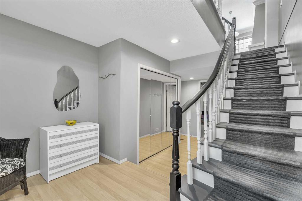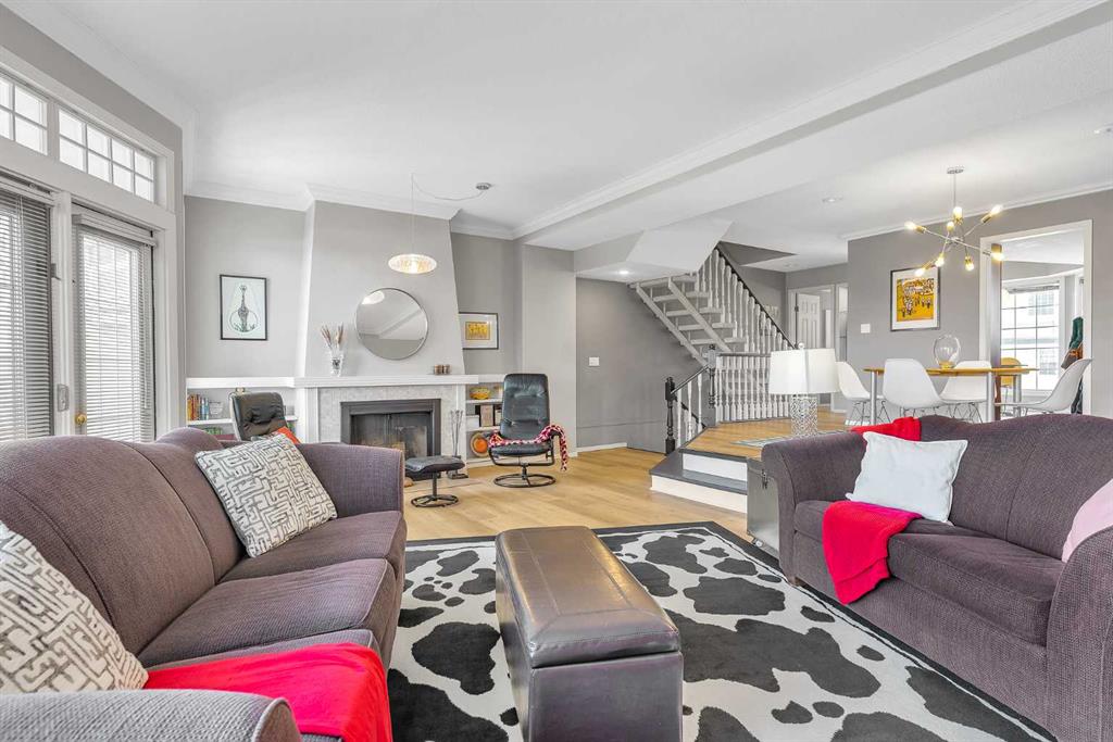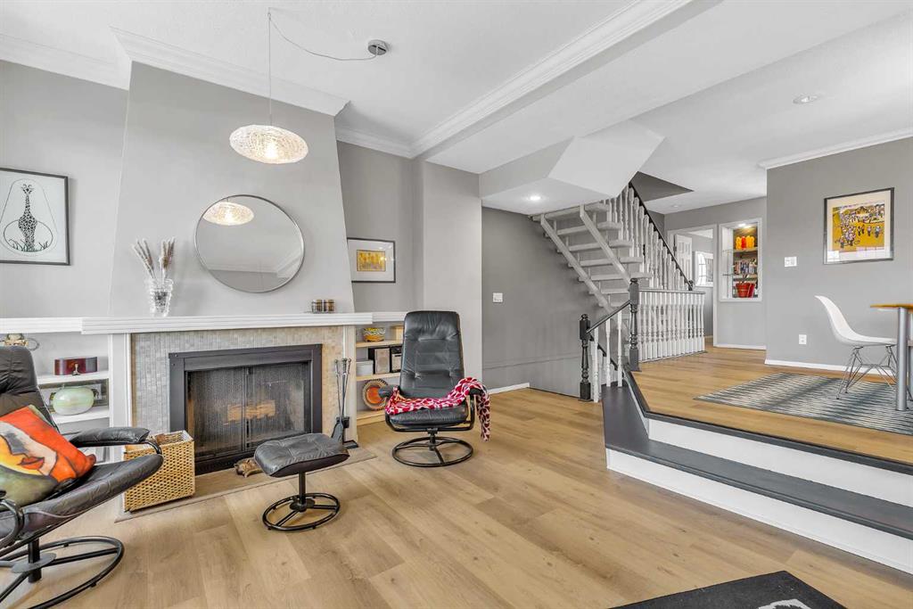Enjoy spacious living in sought-after Varsity with this beautifully updated 3-bed , 2.5-bath townhouse. You will find the perfect blend of comfort and convenience in an unbeatable location, with over 2,100 sq ft of living space across three finished levels. A spacious foyer with a large closet and laundry, storage, and mechanical room. Upstairs, the bright, open-concept living and dining area offers a seamless flow into a large, private patio—ideal for indoor/outdoor living during the summer. An inviting living room featuring a wood-burning fireplace with a gas starter and custom built-in cabinetry. Large windows allow an abundance of natural light to pour in. Luxurious vinyl plank flooring flows through the main living areas, complemented by updated modern lighting and newer windows throughout (except living room bay window is original). French doors lead to a west-facing deck with no rear neighbours—perfect for relaxing or entertaining under the shade of mature trees. The kitchen offers ample cabinetry, a pantry, updated stainless steel appliances including a brand new dishwasher, gas stove with 220 V outlet , and a large window over the sink that brings in plenty of morning sunshine. A casual eating area sits adjacent, with a conveniently located bathroom on the main floor. Upstairs, the spacious primary suite features French doors, a Juliet balcony, a walk-in closet, and an updated ensuite with a jetted tub. The second bedroom is generously sized, while the third bedroom comes with French doors, making it ideal for a home office or guest room. A second full bathroom completes the upper level. The heated tandem double garage accommodates two vehicles plus a driveway for an extra parking. Additional features: triple-pane windows for the upper west windows, newer patio doors, newer furnace, hot water heater (2013), and all hinges are soft close. Landmark Estates features serene walking paths, picturesque ponds, and charming seating areas, creating a tranquil retreat in the heart of the city. Pets friendly with board approval (Units can house a maximum of: one (1) dog; one (1) dog and one (1) cat; or two (2) cats). Ideally located within walking distance to Market Mall, the University of Calgary, and public transit, and just minutes from Foothills Medical Centre, Alberta Children\'s Hospital, and the scenic Bow River Pathway System. A rare opportunity to own a spacious townhome in one of northwest Calgary’s most convenient locations. Call to book your private viewings today!